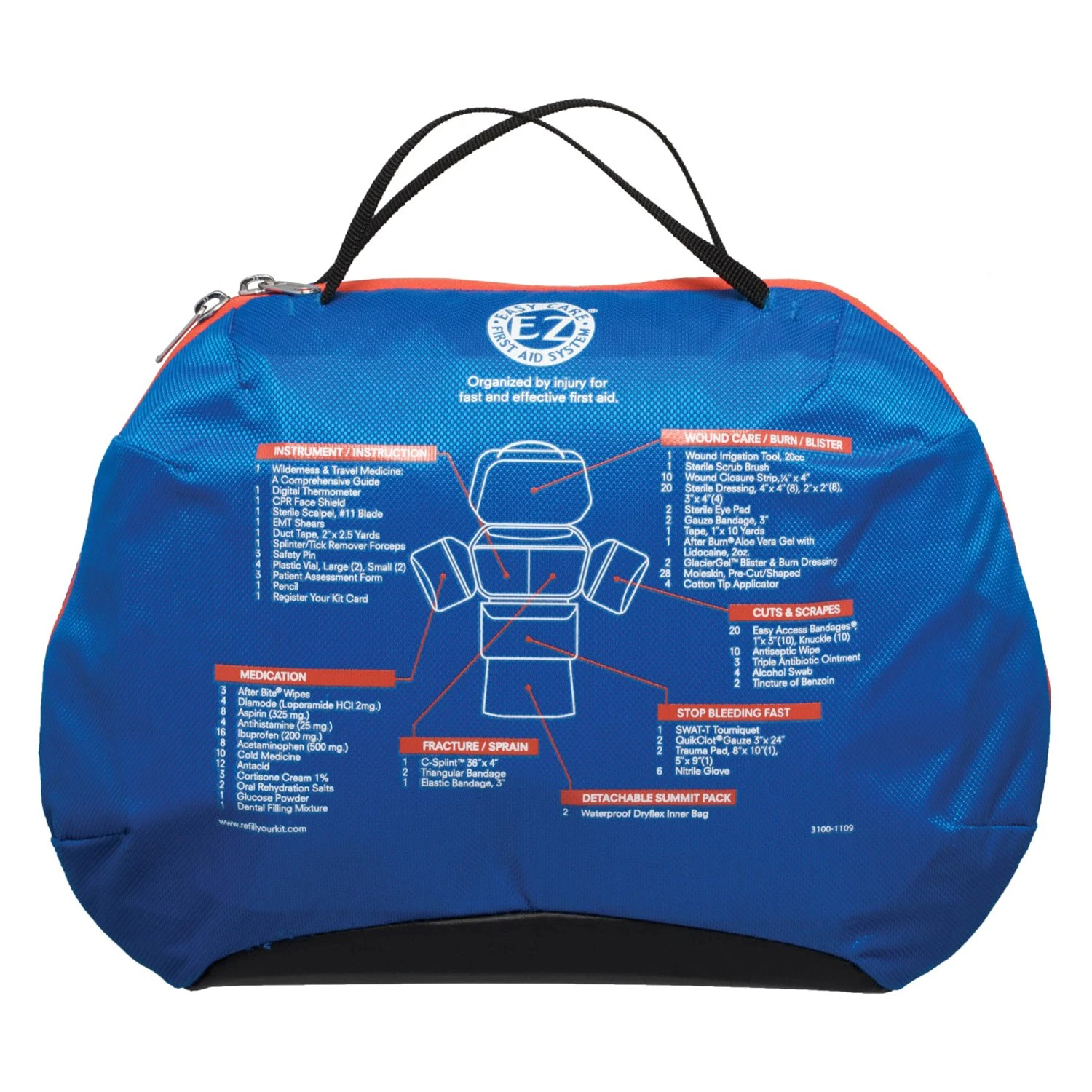 - Find supplies quickly using the external kit map for fast reference of all kit contents and the Easy Care First Aid™ System, which organizes contents by injury into clearly-labeled pockets
