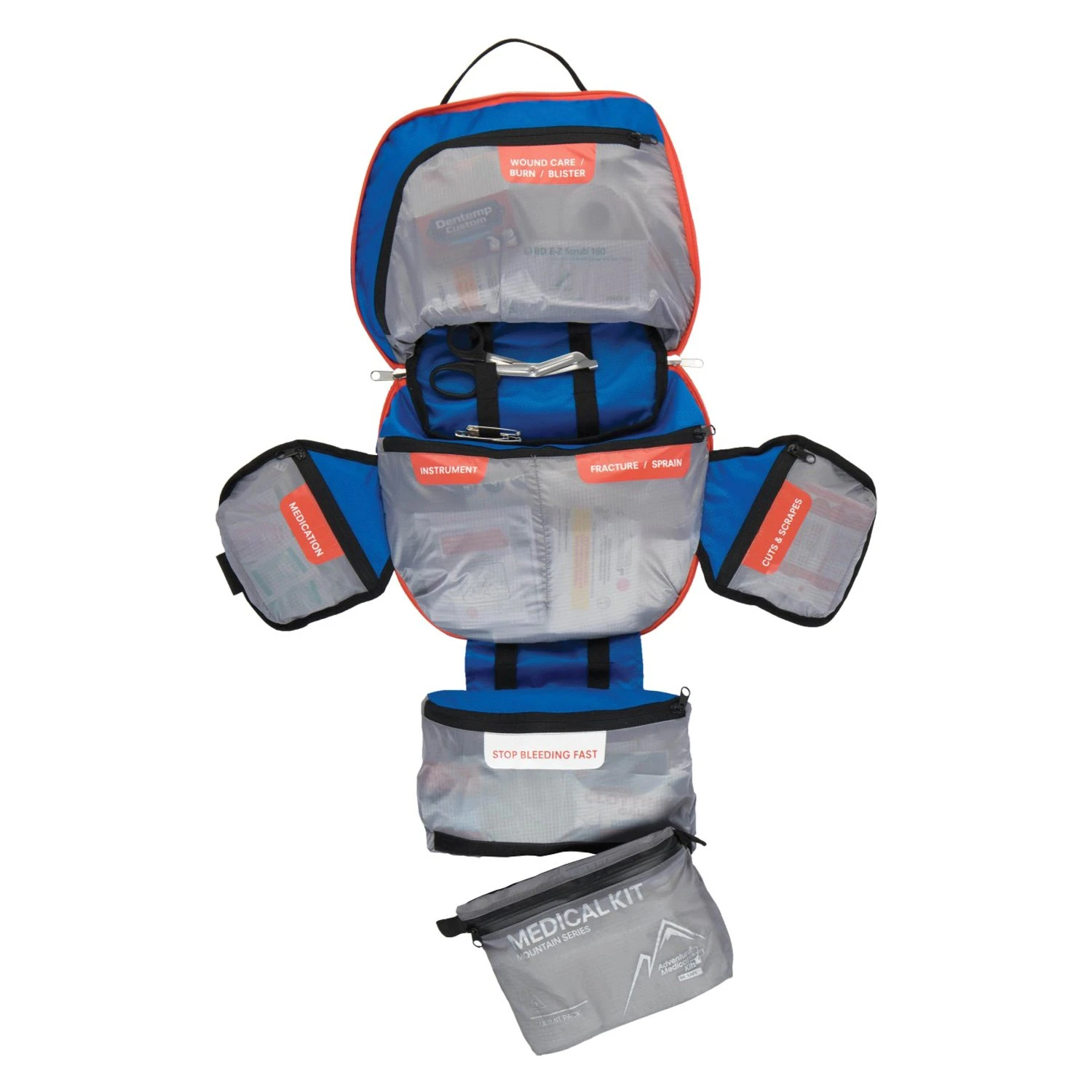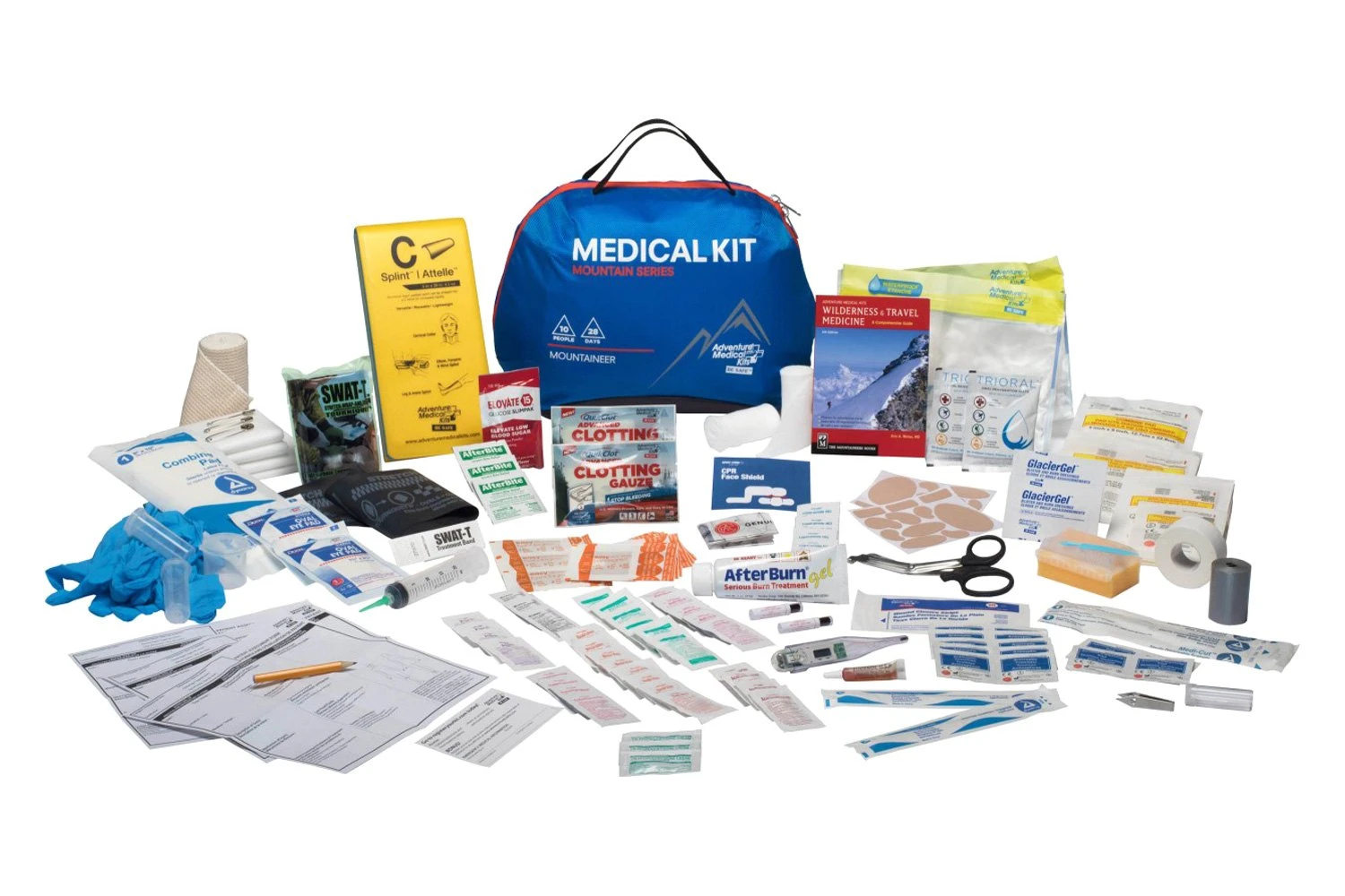 Mountain™ Mountaineer Medical Kit by Adventure Medical Kits®. The Mountaineer sets the standard for mountaineering first aid kits with supplies capable of treating a group of 10 people for up to 28 days over a broad range of injuries. Trusted by the International Mountain Guides as an expedition first aid kit, this group medical kit is equally suited for urban disasters or other situations where medical care is inaccessible. Inside, you’ll find wilderness first aid tools like QuikClot™, a flexible C-Splint™, and SWAT-Tourniquet, as well as a deep stock of hiking essentials like GlacierGel™, bandages, and medications. All the contents are organized by injury into the Easy Care™ organization system to help you or the team you’re guiding find supplies quickly in an emergency. From the detachable summit kit for ultralight summit bids to the durable, water-resistant medical bag, the Mountain Mountaineer kit was designed with the mountains in mind, enabling you to safely attain your goals.