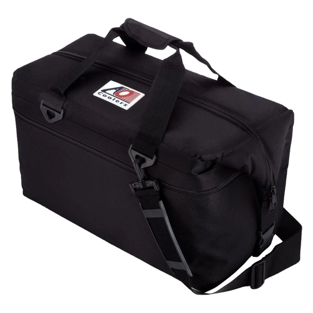 Canvas™ 36-Can Black Cooler Bag by AO Coolers®. Removable Shoulder Strap Clip-Down ends Twice the insulation of other soft-sided coolers Guaranteed to hold ice for 24 hours in 120 degree weather Leak-Proof Liner A side pocket for dry items Use For: Perfect for a day or two on the water or camping Hunting and fishing Parties Sporting Events.