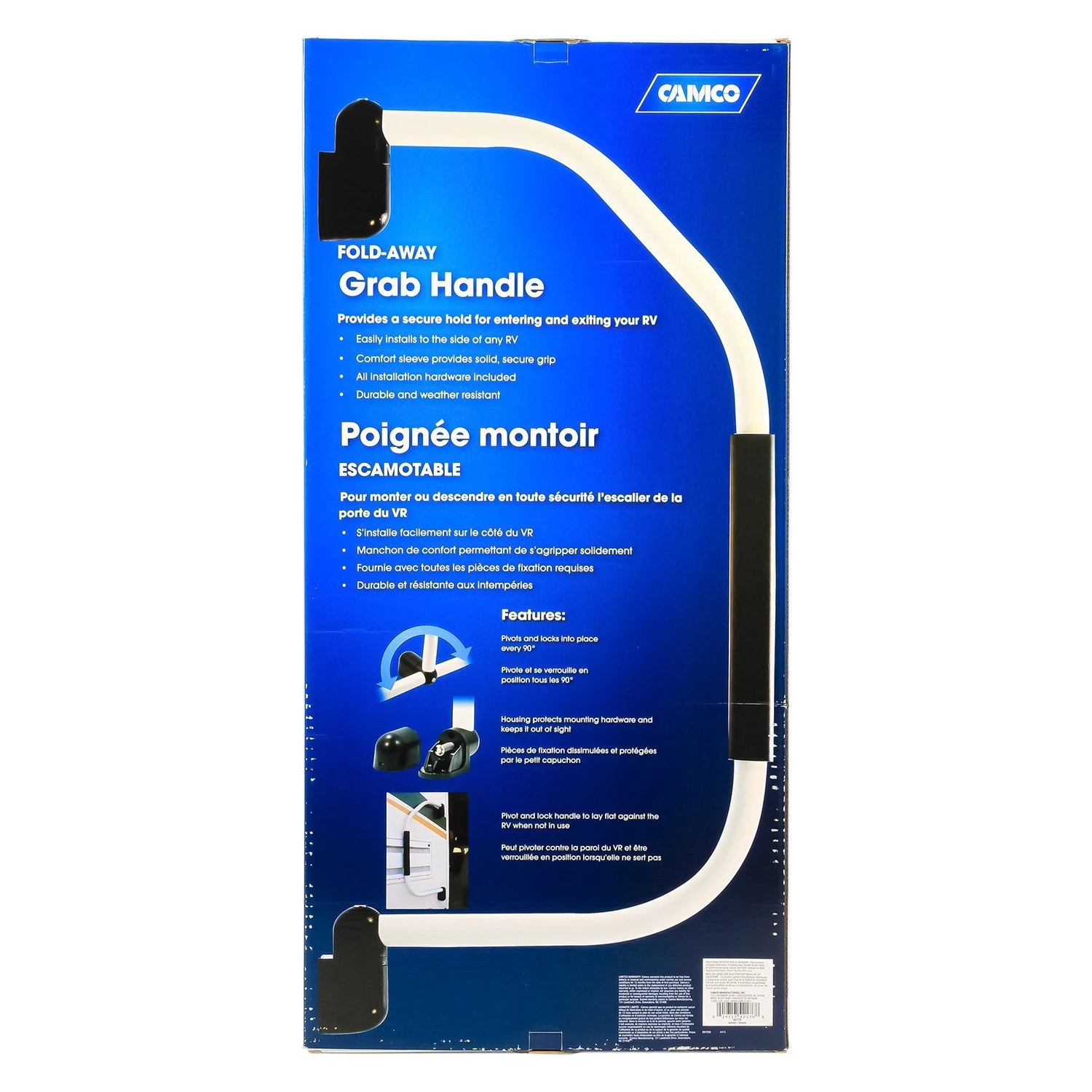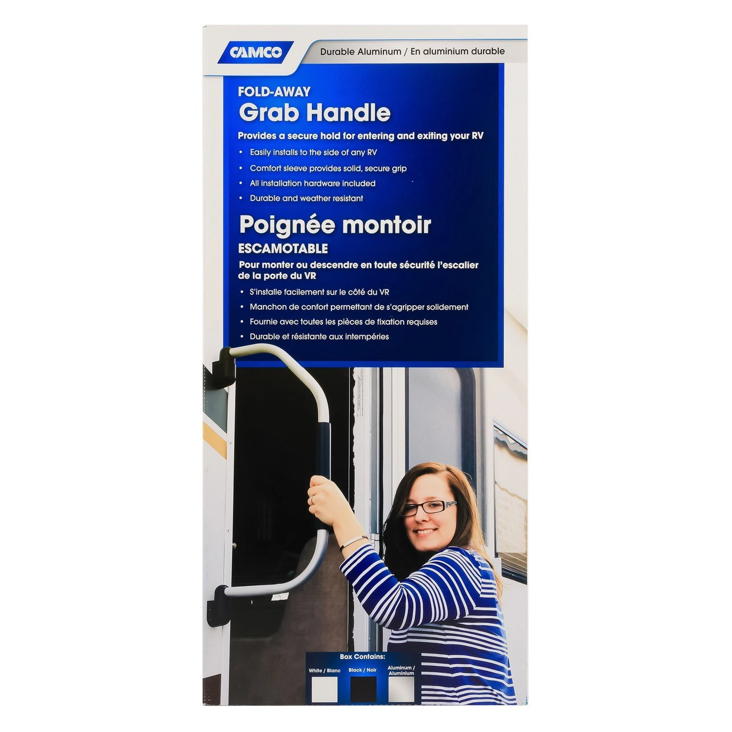 27.2″L Silver Aluminum Long Folding Grab Handle (42177) by Camco®. The Camco RV Grab Handle is a simple, efficient way to make entering and exiting your RV safer. After the one-time, easy installation, the Camco RV Grab Handle provides a secure hand-hold on the left or right side of your RV door. When not in use, the Grab Handle easily lifts and rotates to lay flat against the side of the RV. The durable Aluminium construction with UV resistant plastic brackets is built to last. Use the Camco RV Grab Handle to replace your old or broken grab handle, or to install on an RV that has never had a grab handle.