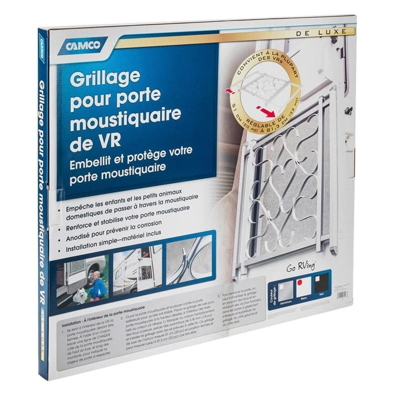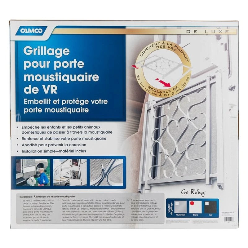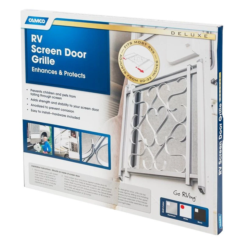 Deluxe™ White Screen Door Grille (43997) by Camco®. Camco’s RV Aluminium Screen Door Deluxe Grille protects the RV screen door. It adds a sturdy feel to the RV door and saves repairs to screens. This grille helps prevent children and pets from falling through the screen.