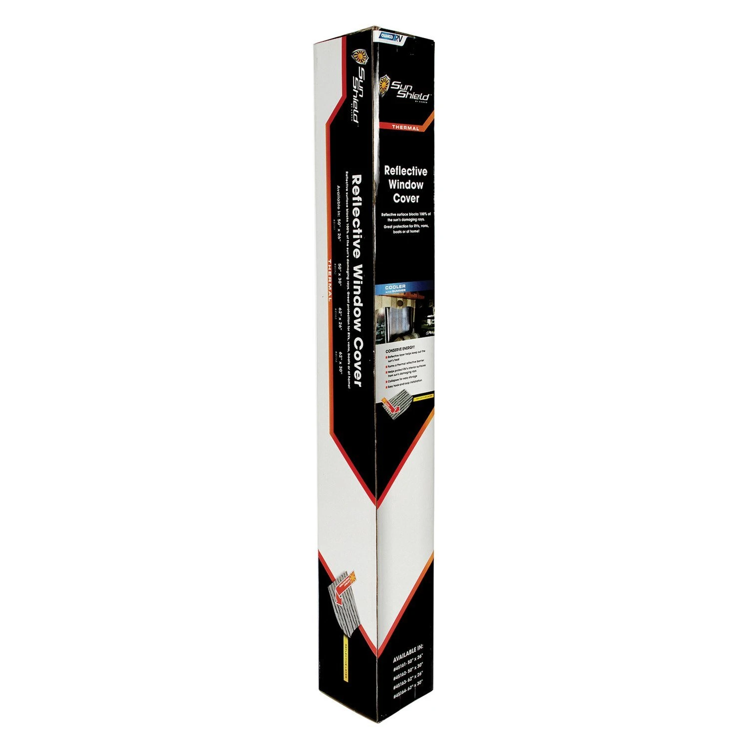 SunShield™ Silver Thermal Reflective Window Cover (45161) by Camco®. Camco Reflective Window Covers protect the interior of your coach from UV rays and assist with temperature control. Air-filled cells encapsulated in lightweight, flexible polypropylene between two layers of reflective film. Collapses for storage and attaches with hook-and-loop fasteners for simple installation.