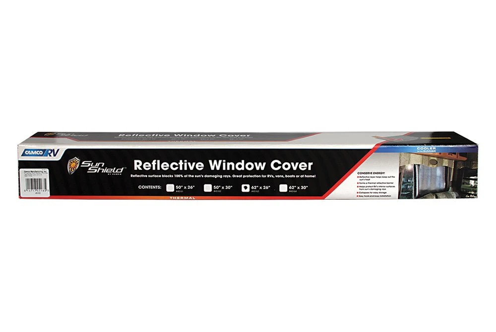 SunShield™ Silver Thermal Reflective Window Cover (45163) by Camco®. Camco Reflective Window Covers protect the interior of your coach from UV rays and assist with temperature control. Air-filled cells encapsulated in lightweight, flexible polypropylene between two layers of reflective film. Collapses for storage and attaches with hook-and-loop fasteners for simple installation.