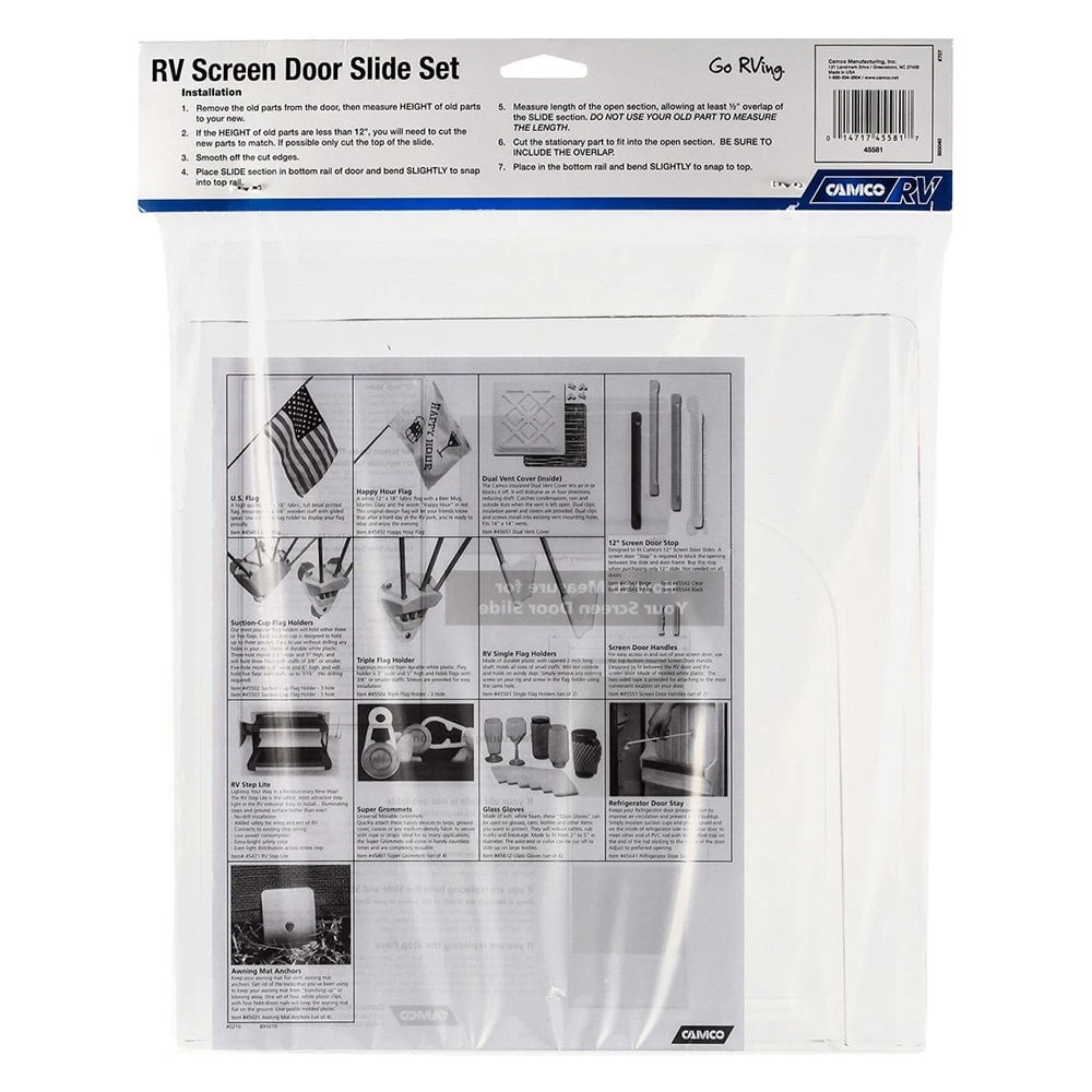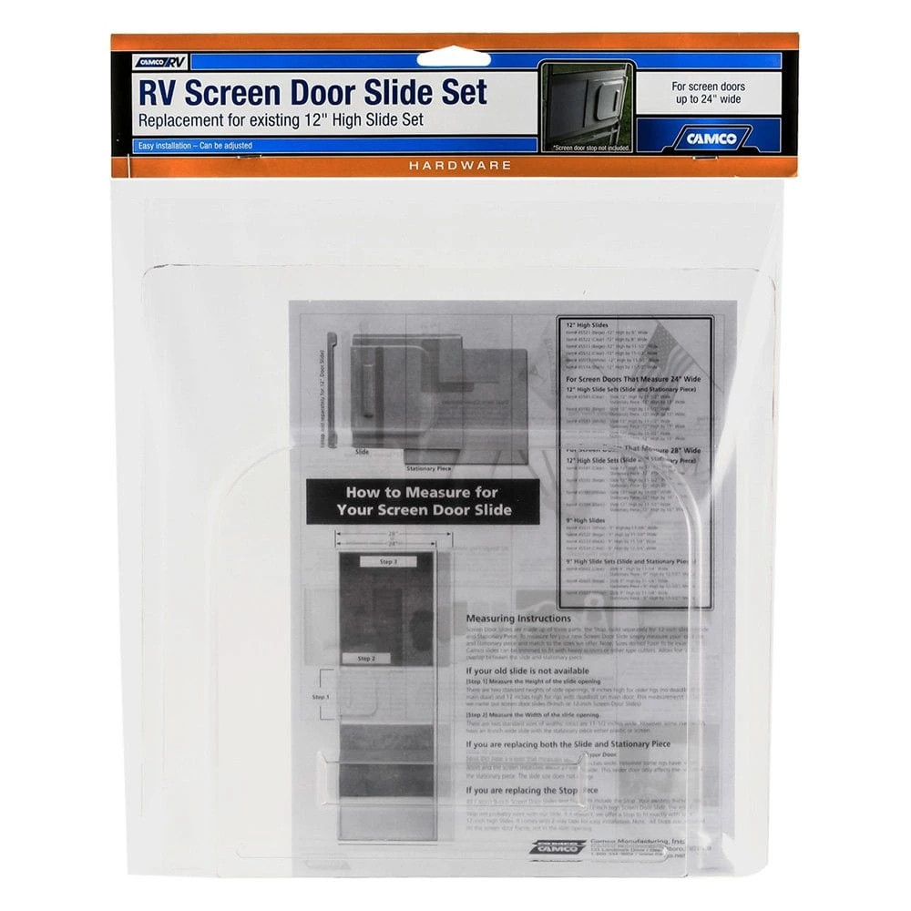 Clear Slide Set for Screen Doors up to 24″ Width (45581) by Camco®. Camco’s Screen Door Slide Set is ideal for new or replacement installations on RVs. Designed with great precision and manufactured of high-grade materials, it features impeccable quality and provides reliable and safe service for years to come.