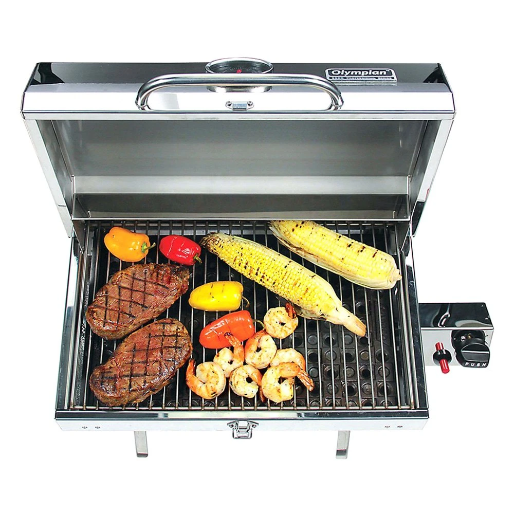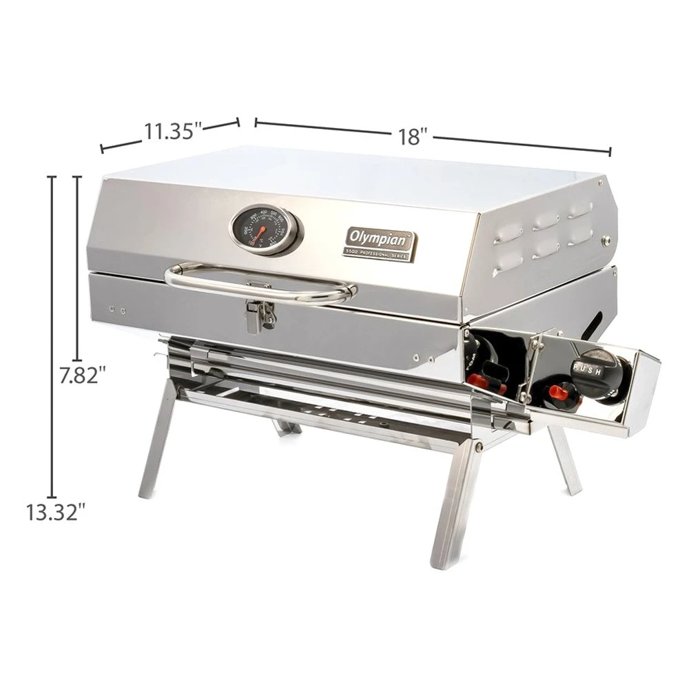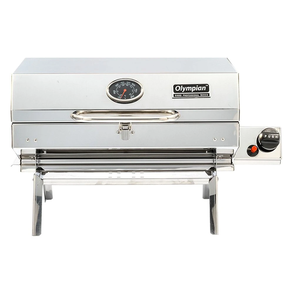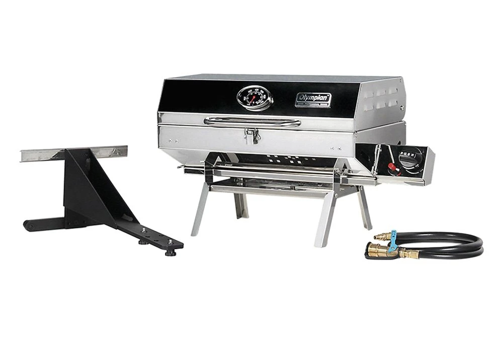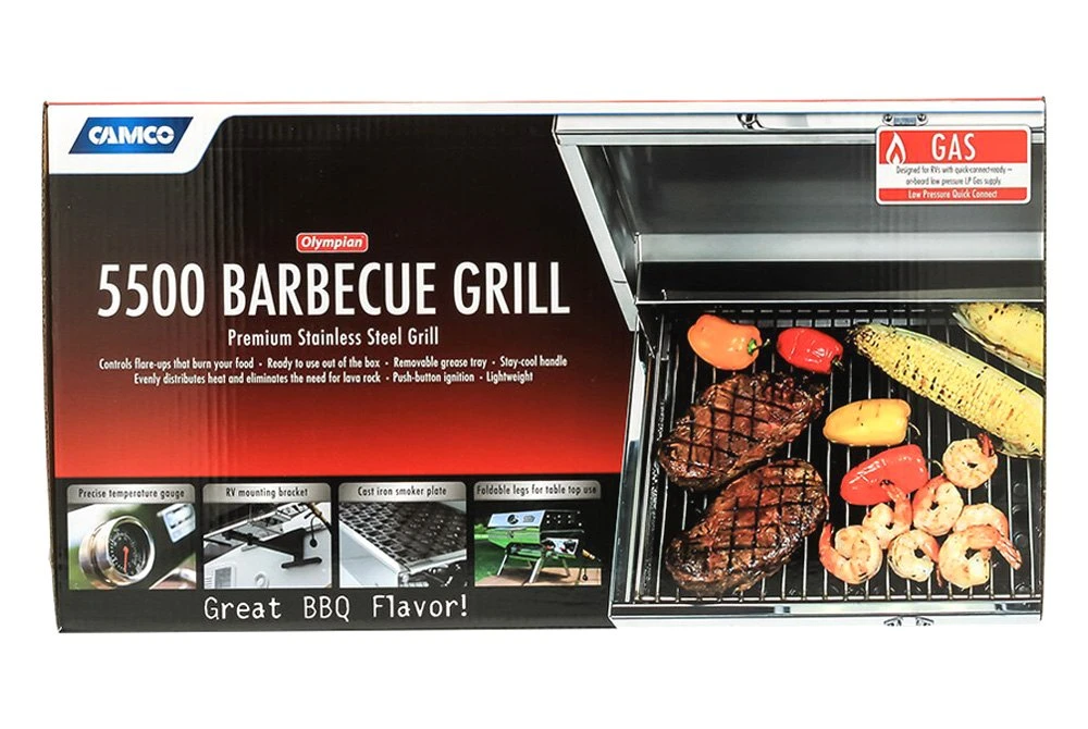 Olympian 5500 Portable Gas Grill (57305) by Camco®. Is designed for RV and outdoor use and is easy to transport. This high quality lightweight 304 stainless-steel barbecue has a large cooking area of 180 sq in. Its cast iron smoker plate is designed to offer the fullest flavor while minimizing grease fires. The stainless-steel burner heats up faster, is easier to clean, and resists rust. The grill is ready to use straight from the box, only assembly required is the mount to hang the grill on the RV mounting rail. It includes a quick-connect hose and valve to use the low-pressure propane supply on an RV or trailer that has a built-in low pressure quick-connect propane connection. The Camco Quick-Connect x ACME Propane Hose (57629) or Quick-Connect x Throwaway Propane Hose (57628) must be purchased separately to use the grill with a 20 lb propane cylinder or 1 lb throwaway propane cylinder. Weighs approximately 26 lb.