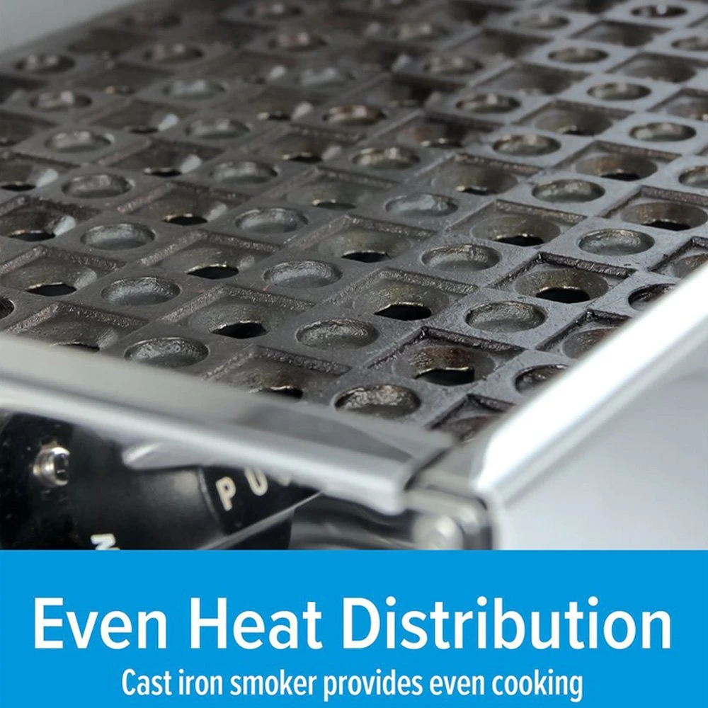 - Cast iron smoker provides even cooking