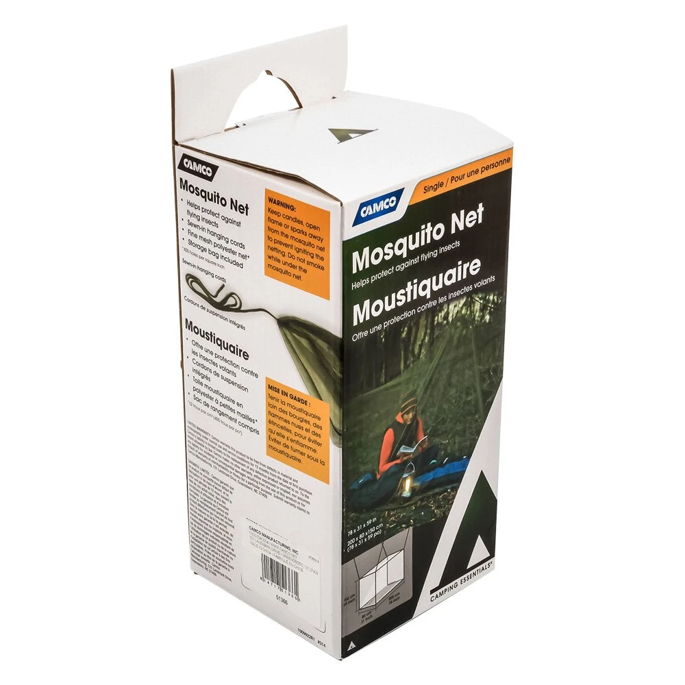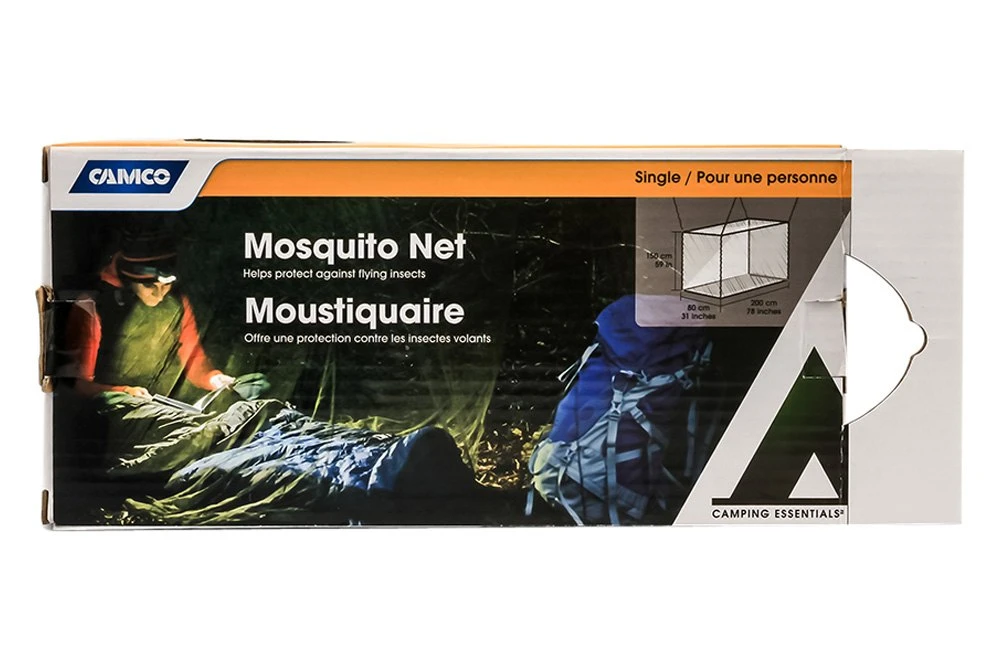 78″ L x 31″ W x 59″ H Mosquito Net by Camco®. The Camco Mosquito Net is an important addition to your campsite. Keep your sleep mosquito-free underneath this net. It has attached strings for hanging and fine mesh that keeps most bugs out. The dark green color won’t stand out in wooded areas, and the storage bag makes it easy to pack and take anywhere.