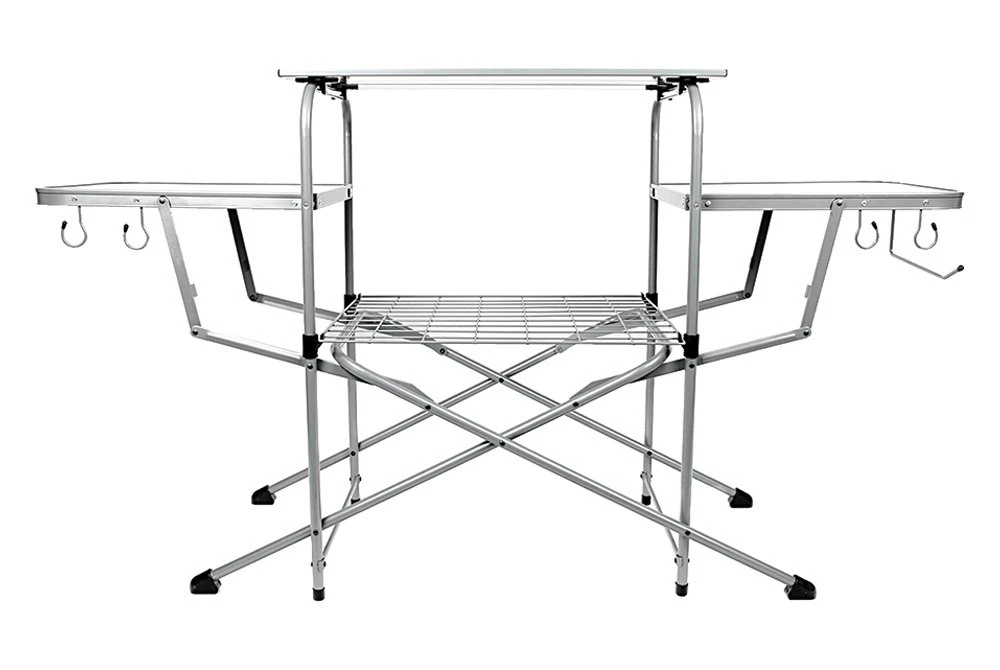 Deluxe Gray Folding Grill Table by Camco®. Spacious grill table has a lightweight, high strength steel frame and an aluminum table top. Table is quick and easy to set-up. Great for picnics, camping, sporting events and backyards.