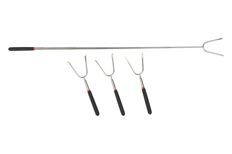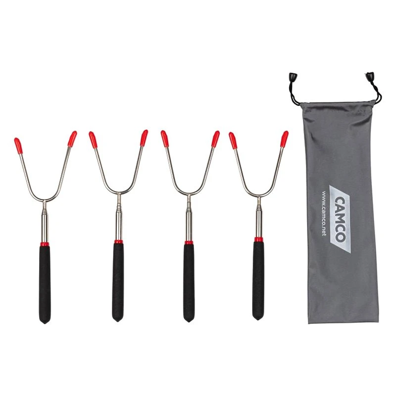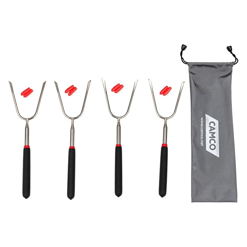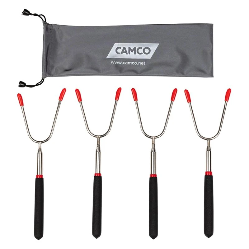 Telescoping Roasting Forks by Camco®. Camco’s Telescoping Roasting Forks allow you to roast food over an open fire. They are the perfect accessory for camping, hiking and outdoor gatherings. Each fork features two prongs for skewering hotdogs, marshmallows, vegetables and more. The roasting forks extend from 9 5/8″ to 34 ¼” long to help ensure a safe distance from the campfire. They are made of strong, food-grade stainless steel with a non-slip PVC handle that won’t burn your hands. These roasting forks are corrosion-resistant and easy to clean.