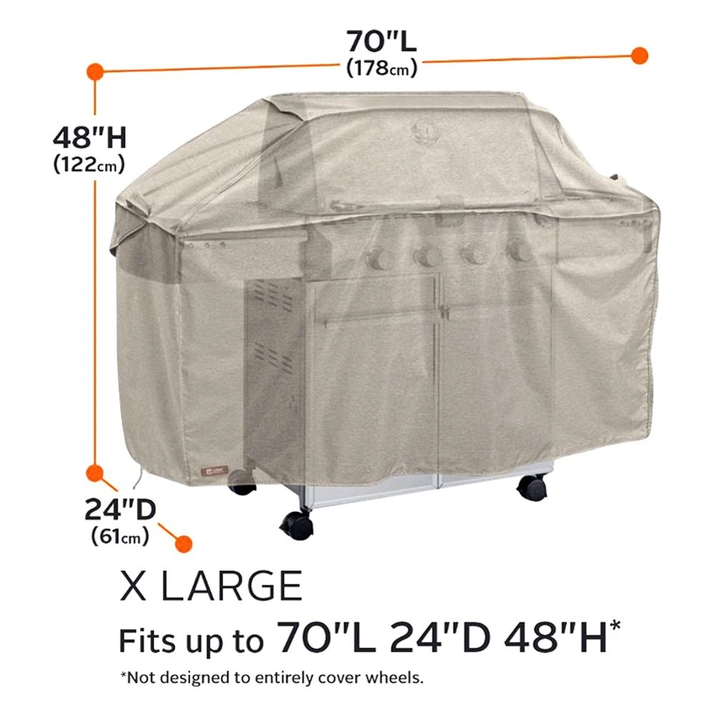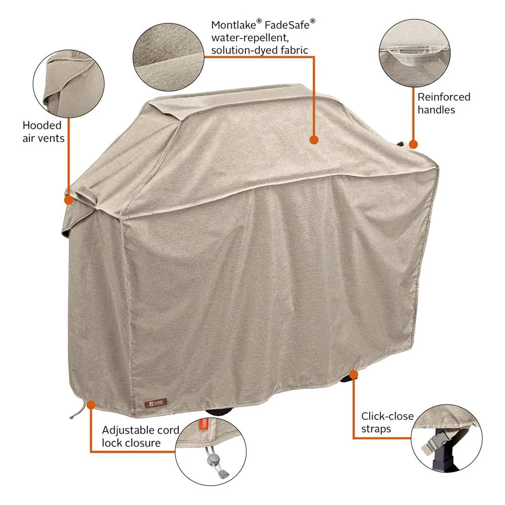 Montlake™ Heather Gray X-Large BBQ Grill Cover (70″L x 24″W x 48″H) by Classic Accessories®. Offering elegant, understated style, these covers feature durable FadeSafe™ Fabric System so they’ll keep their looks while protecting your furniture season after season.