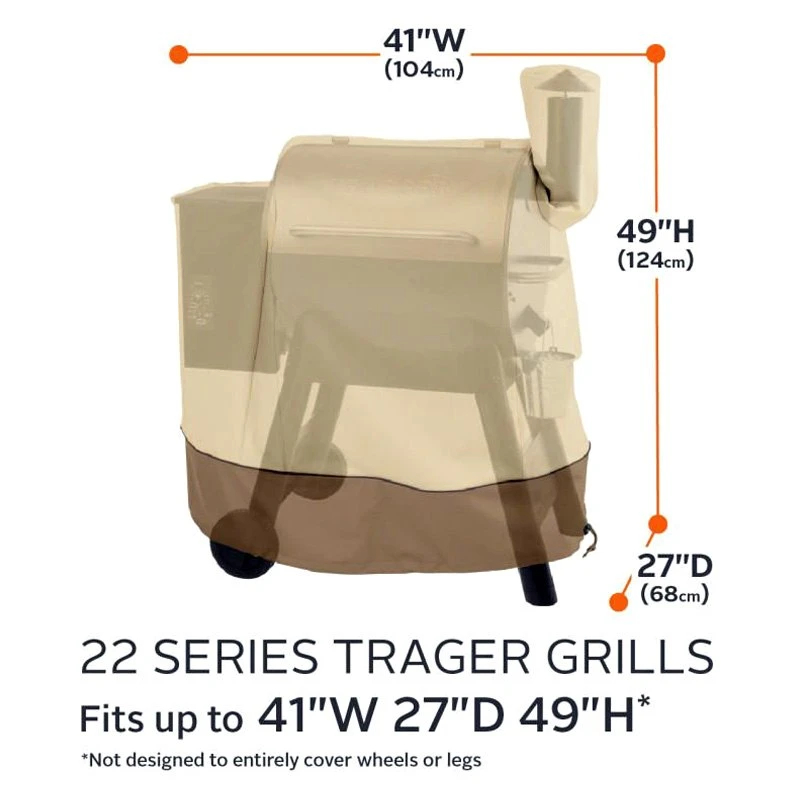 Veranda™ Pebble Grill Cover for Traeger 22 Series Pellet Grill with Exhaust Arm (41″L x 27″W x 49″H) by Classic Accessories®. This top-grade product is expertly made in compliance with stringent industry standards to offer a fusion of a well-balanced design and high level of craftsmanship. Manufactured from industry-leading materials using up-to-date equipment, it ensures everlasting reliability and enduring value. This product is distinguished by total quality assurance, unsurpassed by anybody else