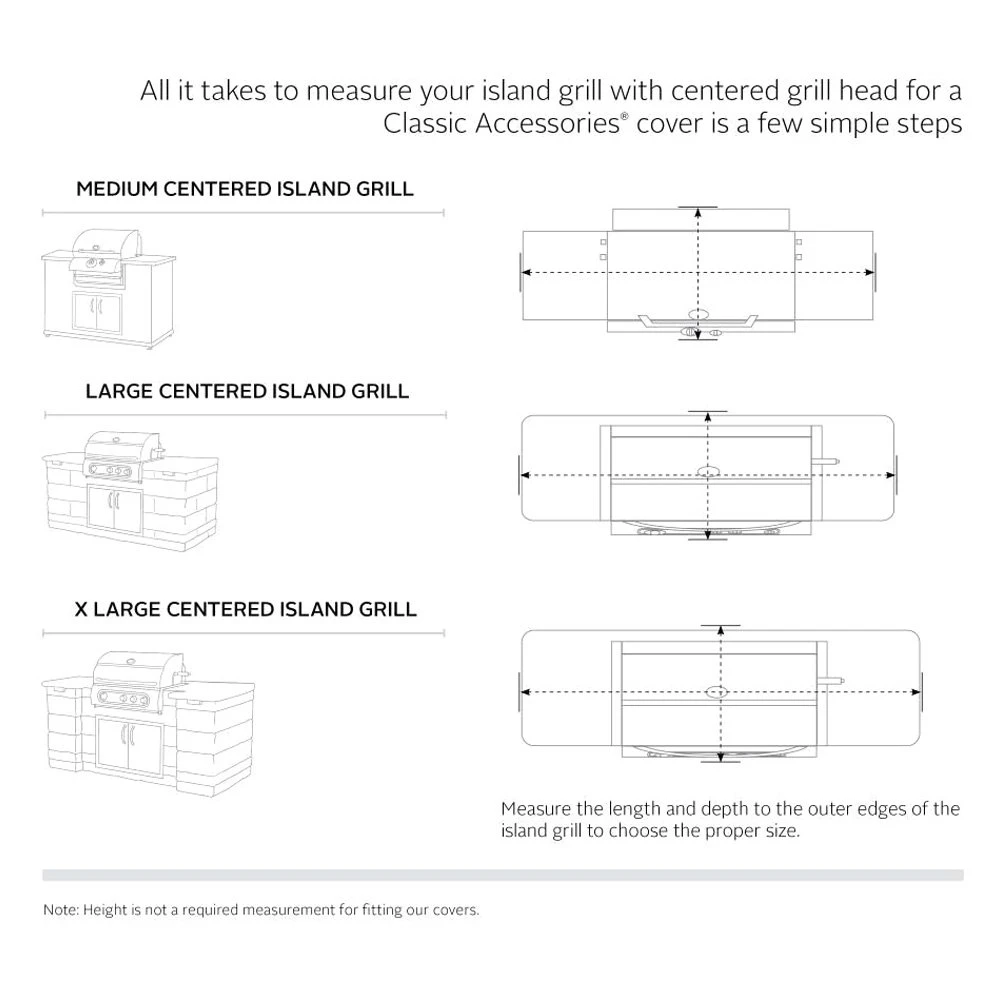 Veranda™ Pebble Medium Island Grill Top Cover for Center Grill Head (78″L x 44″W x 48″H) by Classic Accessories®. A customer favorite for its fashionable design, durability and extensive collection of matching products, the Veranda line features our heavyweight Gardelle™ woven polyester fabric and special water-repellent and resistant undercoating.