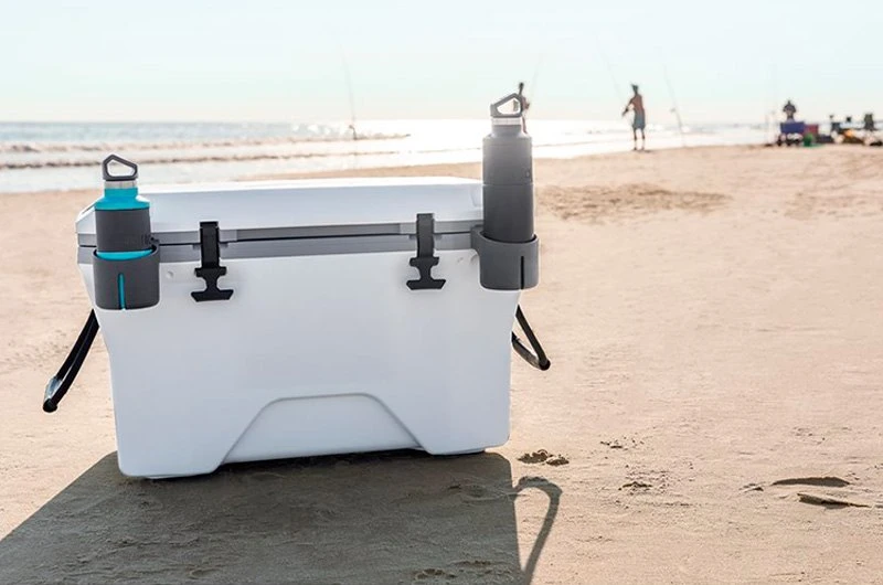 Cooler Cup Holder by Currituck®. The Currituck Cooler Cup Holder Attachment creates a convenient spot to hold your can, bottle, cup or tumbler. Easy to install, the attachment simply connects to any tie-down slot on the front of your Currituck Cooler. Breathable drainage holes prevent water or condensation from pooling within the cup holder.