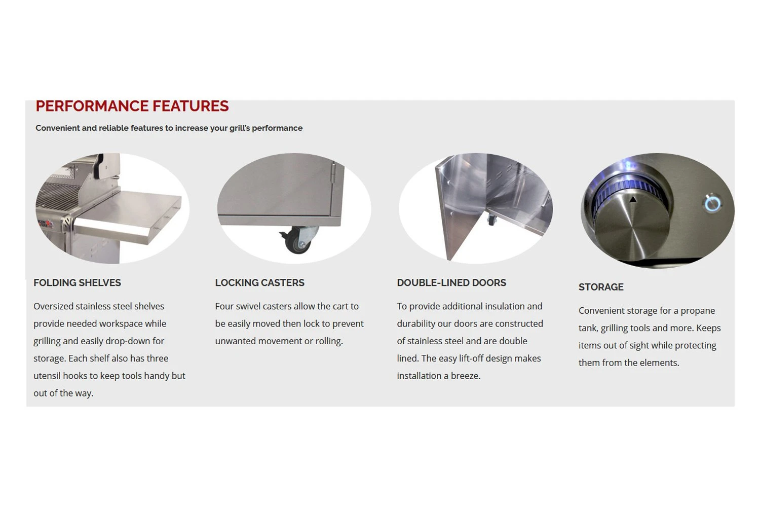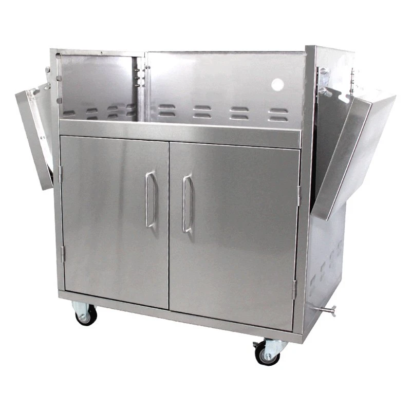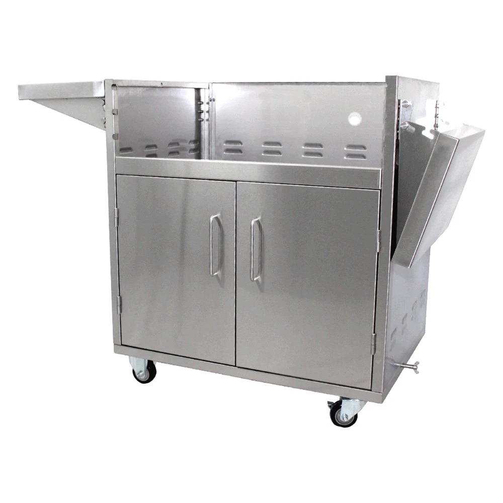 Portable Grill Cart by Dragon Fire Grills®. Designed specifically to fit Dragon Fire Grills Dragon Fire Grill Heads. Beautifully constructed of 304 stainless steel these carts look good, will stand up to the elements and are backed by one of the most comprehensive warranties in the industry. Want extra features? These carts do not disappoint. They feature Dragon Fire Grills simple lock-in grill head design that lets you get set up and ready to grill in no time, easy lift-off doors, locking casters and oversized stainless steel drop-down shelves.