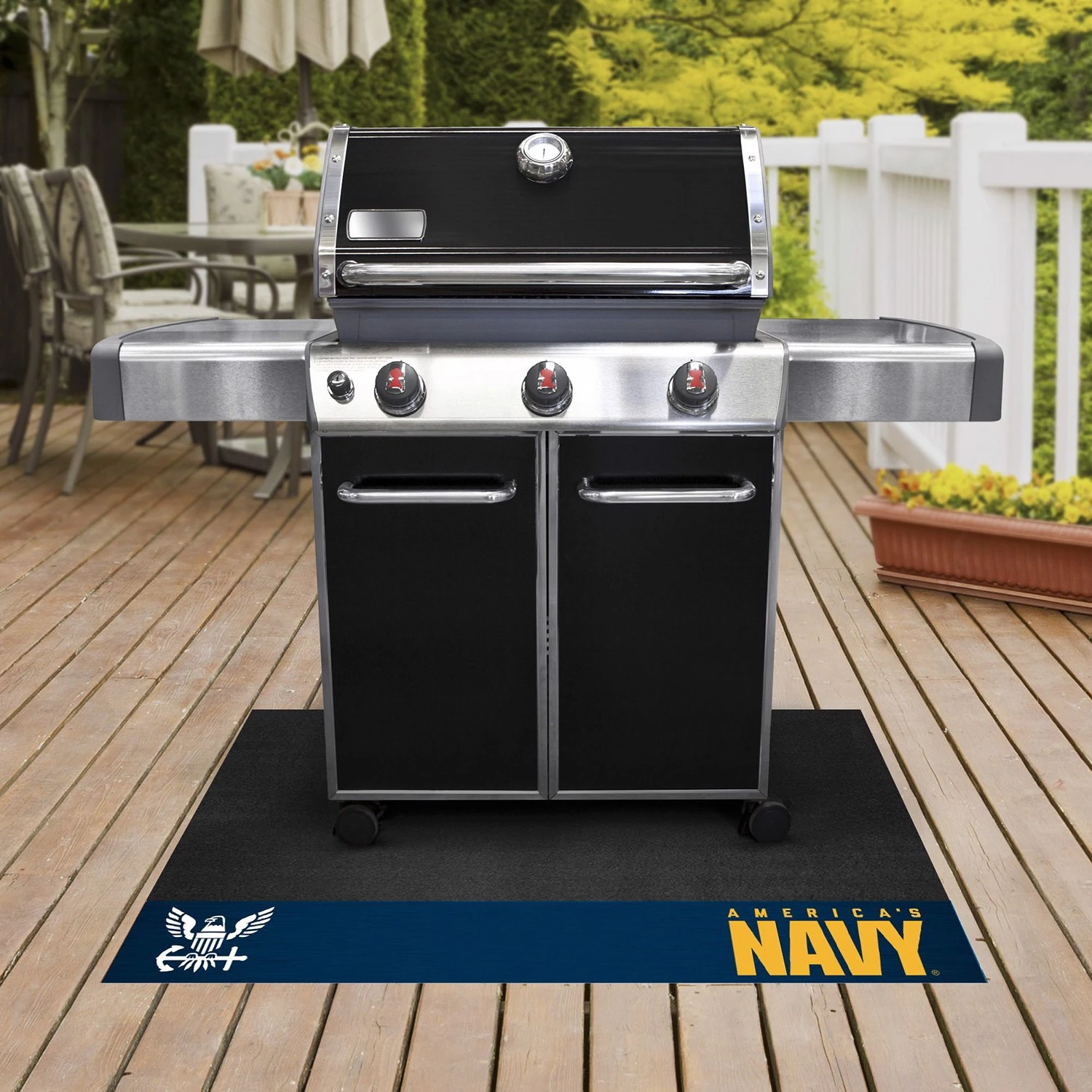 Military “U.S. Navy” 26″ x 42″ Grill Mat with “Navy’s Crest” Logo (15699) by FanMats®. Are you a die-hard sports fan that likes to show off your team pride even while grilling? Then Grill Mats by Sports Licensing Solutions were made for you. Both practical and decorative, they protect your deck or patio while displaying your favorite team!