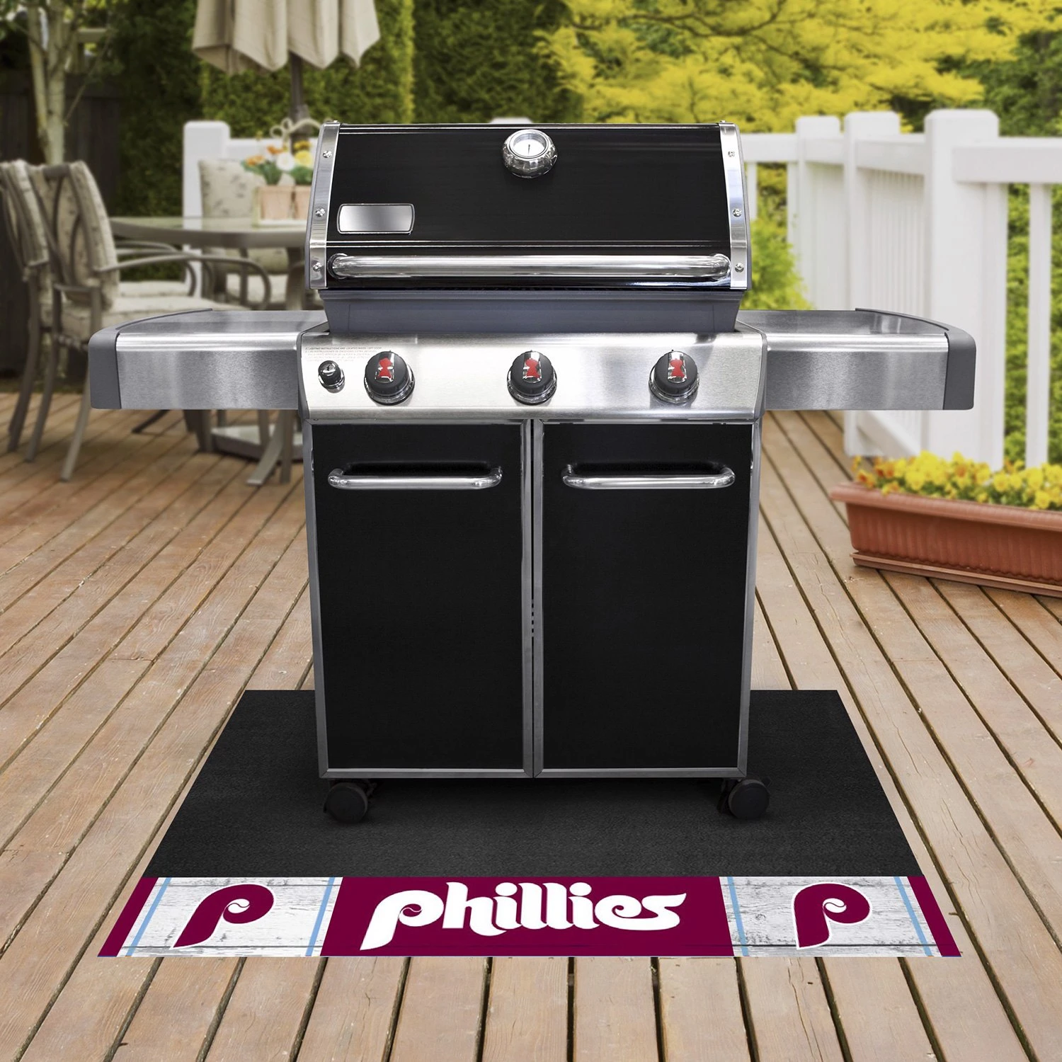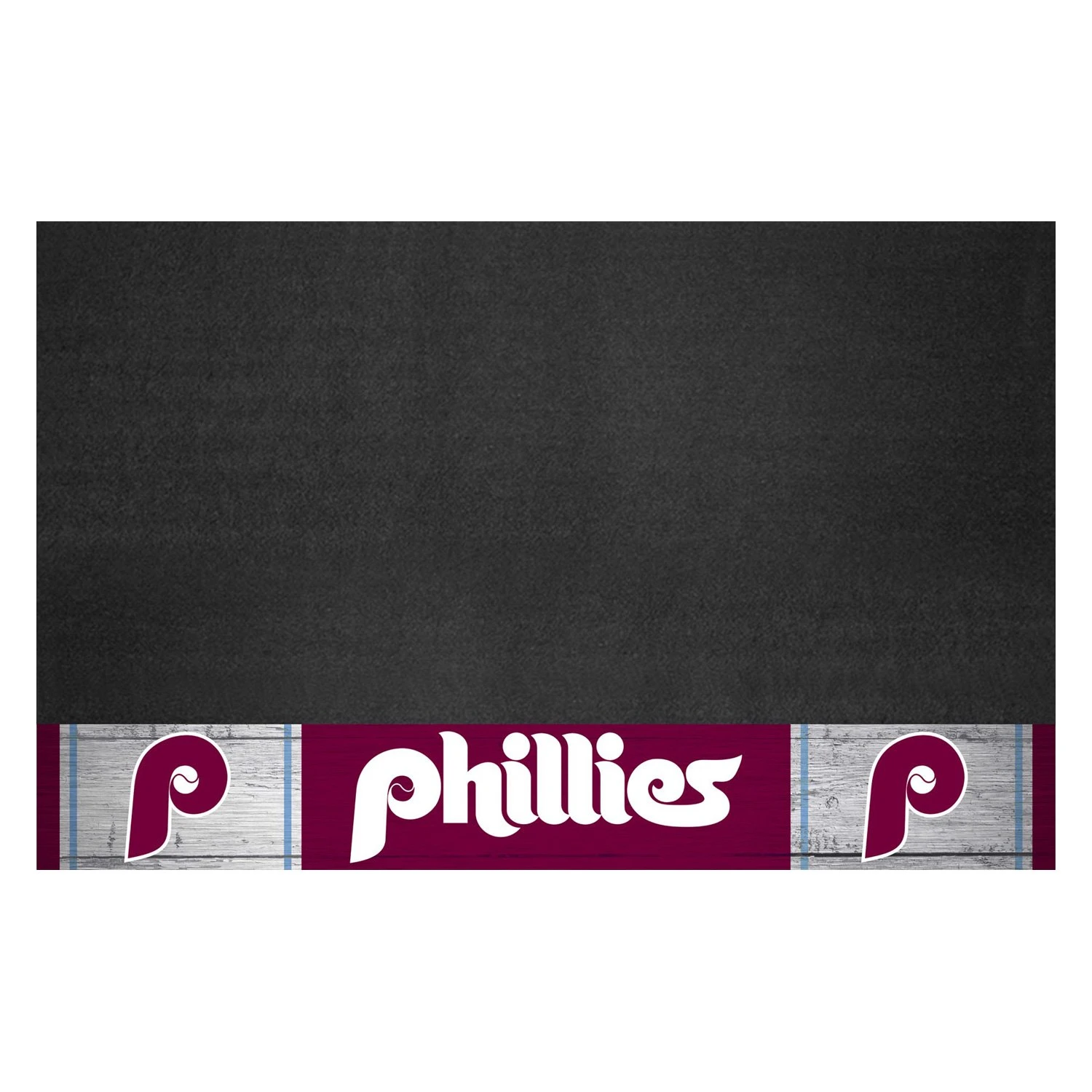 MLB “1987 Philadelphia Phillies” 26″ x 42″ Retro Grill Mat (2189) by FanMats®. Then Grill Mats by Sports Licensing Solutions were made for you. Both practical and decorative, they protect your deck or patio while displaying your favorite MLB Retro Logo! These 100% vinyl Grill Mats fit under most grills, prevents spills from soaking in and staining, and cleans up easily with a garden hose. Keep the mat clean by spraying with water and wiping with a soapy cloth. Not to be used on composite decking material. Made in the USA.