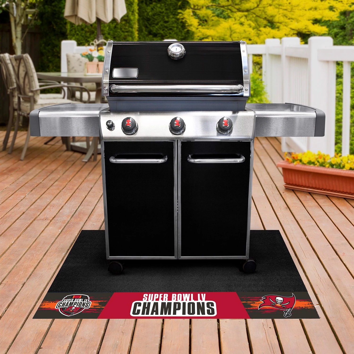 NFL “Tampa Bay Buccaneers” 26″ x 42″ Grill Mat with “Super Bowl LV Champions” Logo (26546) by FanMats®. Are you a die-hard sports fan that likes to show off your team pride even while grilling? Then Grill Mats by Sports Licensing Solutions were made for you. Both practical and decorative, they protect your deck or patio while displaying your favorite team!