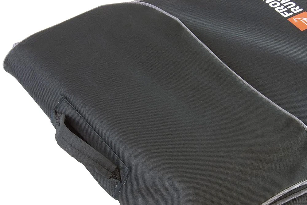 Expander Black Chair Storage Bag by Front Runner Outfitters®. Protect your Front Runner Expander Chair and nearby objects from the elements as well as rattling when stored with this padded canvas bag. Black heavy duty canvas with a padded liner and grey trim. The velcro sealed flap protects chair from the elements and other objects while stowed away in a vehicle or in a closet or while walking to your destination. A clever opening in the top of the bag allows you to use the chair’s handle to carry the chair while in the bag.