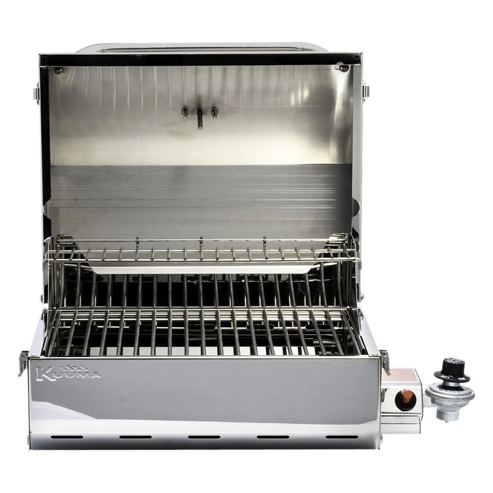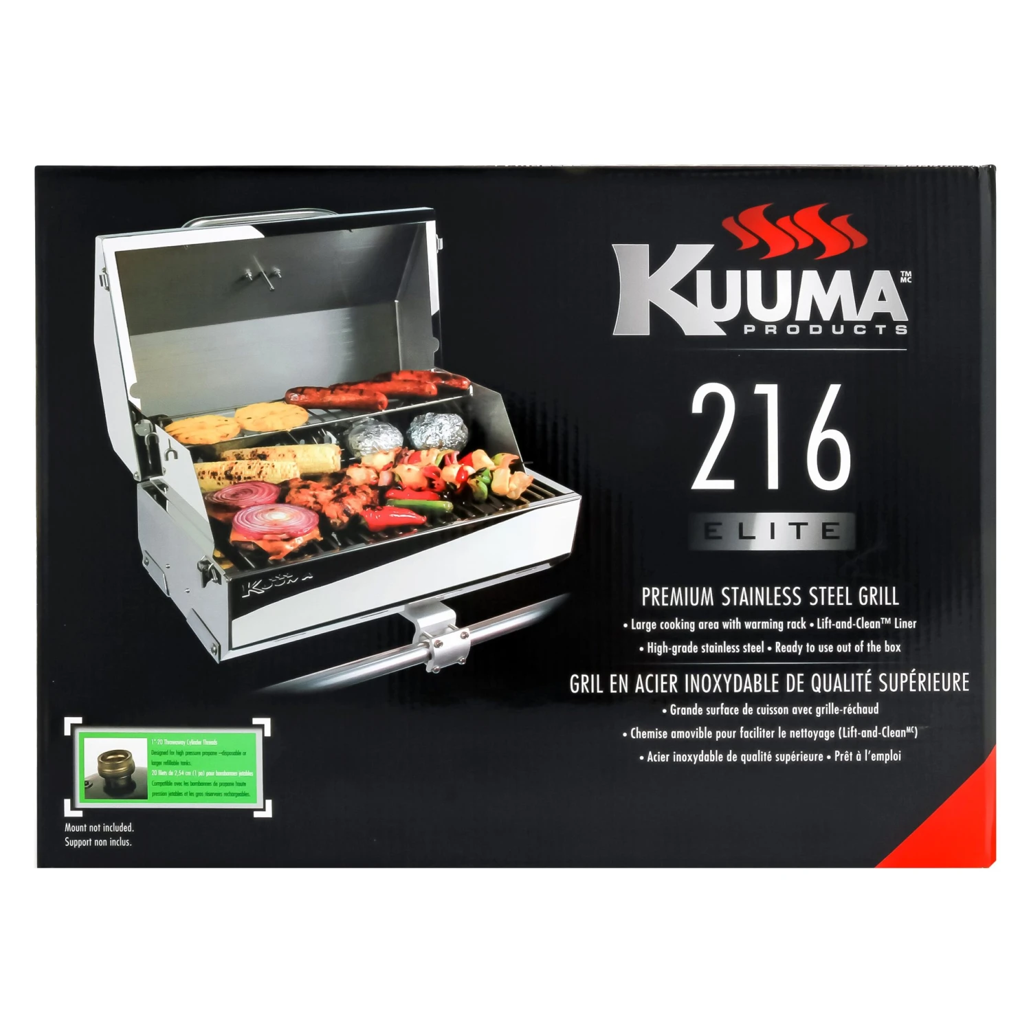 Elite 216 Gas Grill by Kuuma®. The Elite 216 Grill features a simple control knob for precise heat control. A more compact size grill with all the premium features of the Elite 316; simple control knob, integrated fold-away legs, removable warming rack, built-in thermometer, piezo igniter, removable Lift-and-Clean™ liner, grease tray, latching lid and stay-cool handle. The 216 Elite Gas Grill features 216 square inches of cooking surface and maximum airflow to guard against blowouts. Designed for high pressure, disposable 1 lb. propane canisters or larger refillable tanks with hose attachment. Canisters, tanks and hoses sold separately.