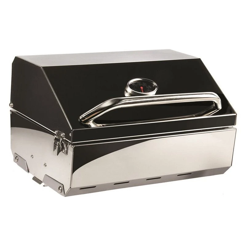 - Built-in thermometer, push button igniter, and fold away legs for easy grilling on any flat surface