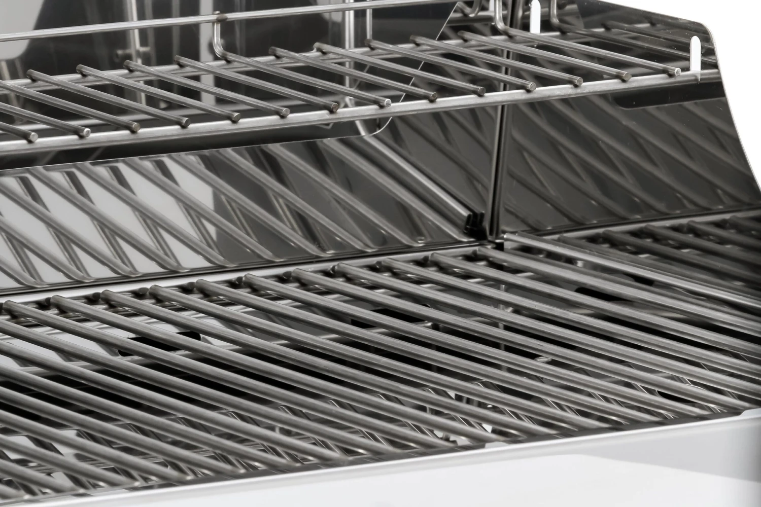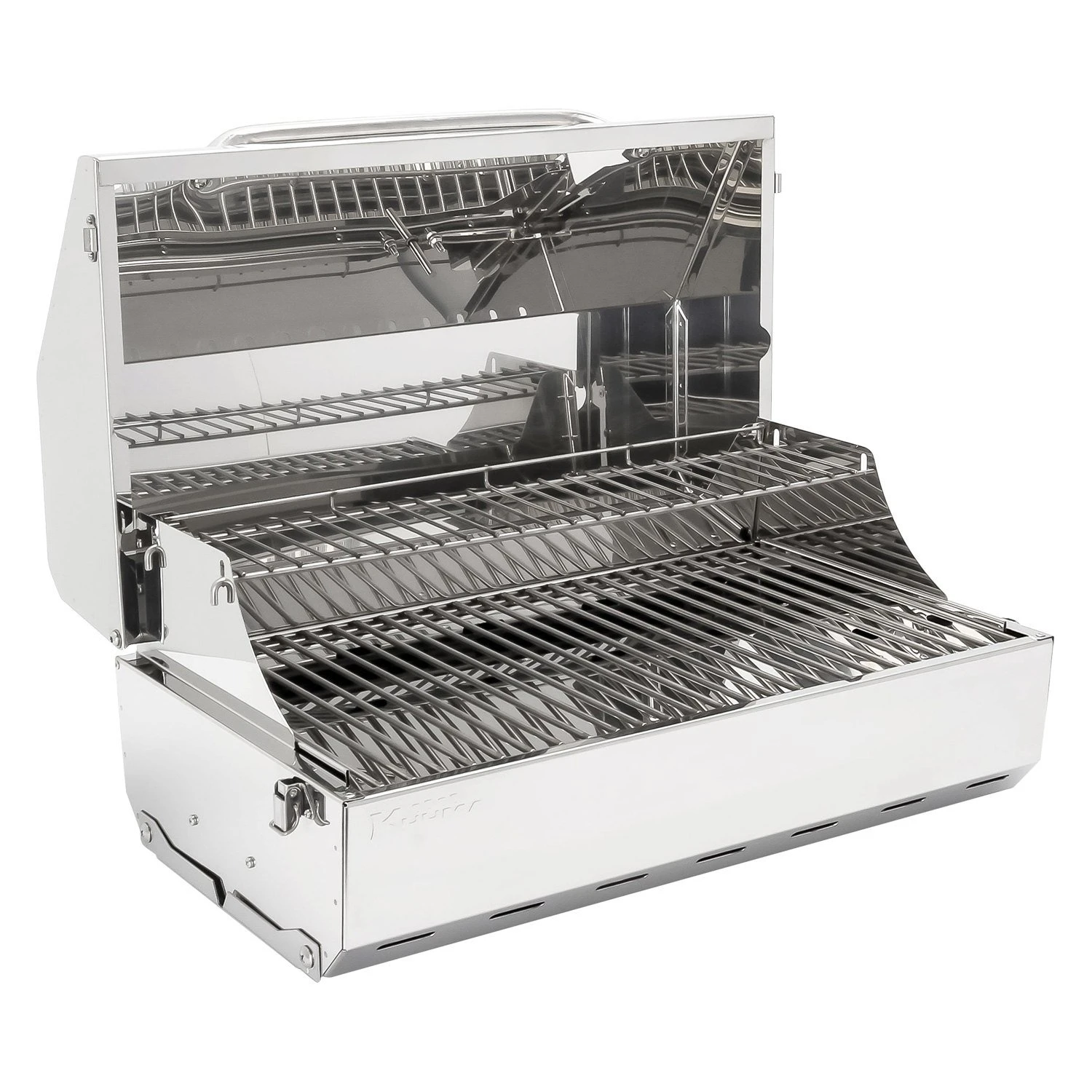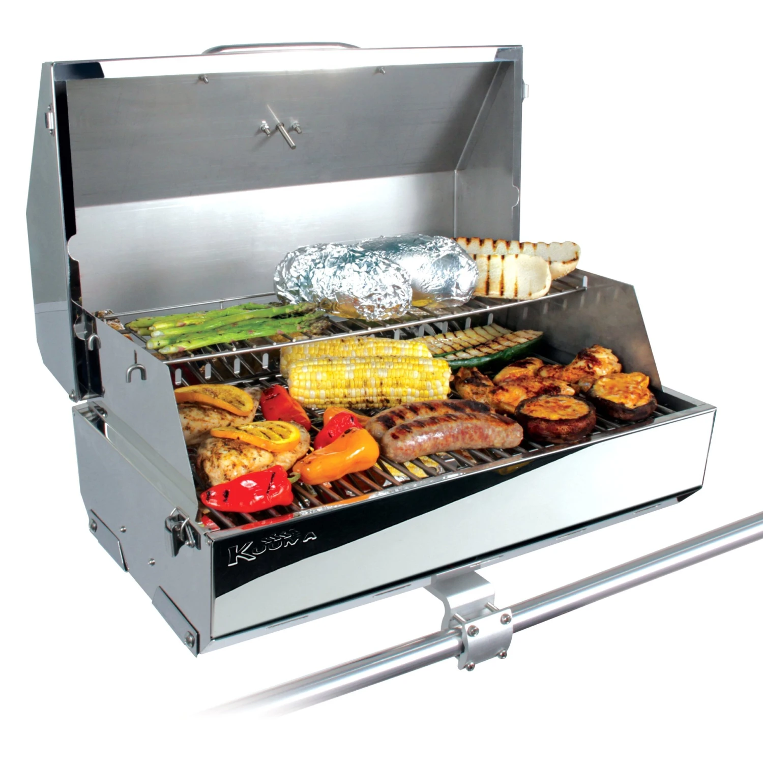Elite 316 Gas Grill by Kuuma®. The Kuuma Elite 316 Grill is an outstanding grill with all of Kuuma’s premium features, ideal for the grilling enthusiast. The Elite 316 offers full-size grilling power and features all in a convenient, compact size. It is constructed of high-quality stainless steel and comes fully assembled. The Elite 316 Grill features a simple control knob for precise heat control, push-button igniter and built-in thermometer. Integrated fold-away legs enable easy grilling on any flat surface. It also features a removable warming rack, removable Lift-and-Clean™ liner, grease tray, latching lid and stay-cool handle. Designed for high pressure, disposable 1 lb propane canisters or larger refillable tanks with hose attachment. Canisters, tanks and hoses sold separately.
