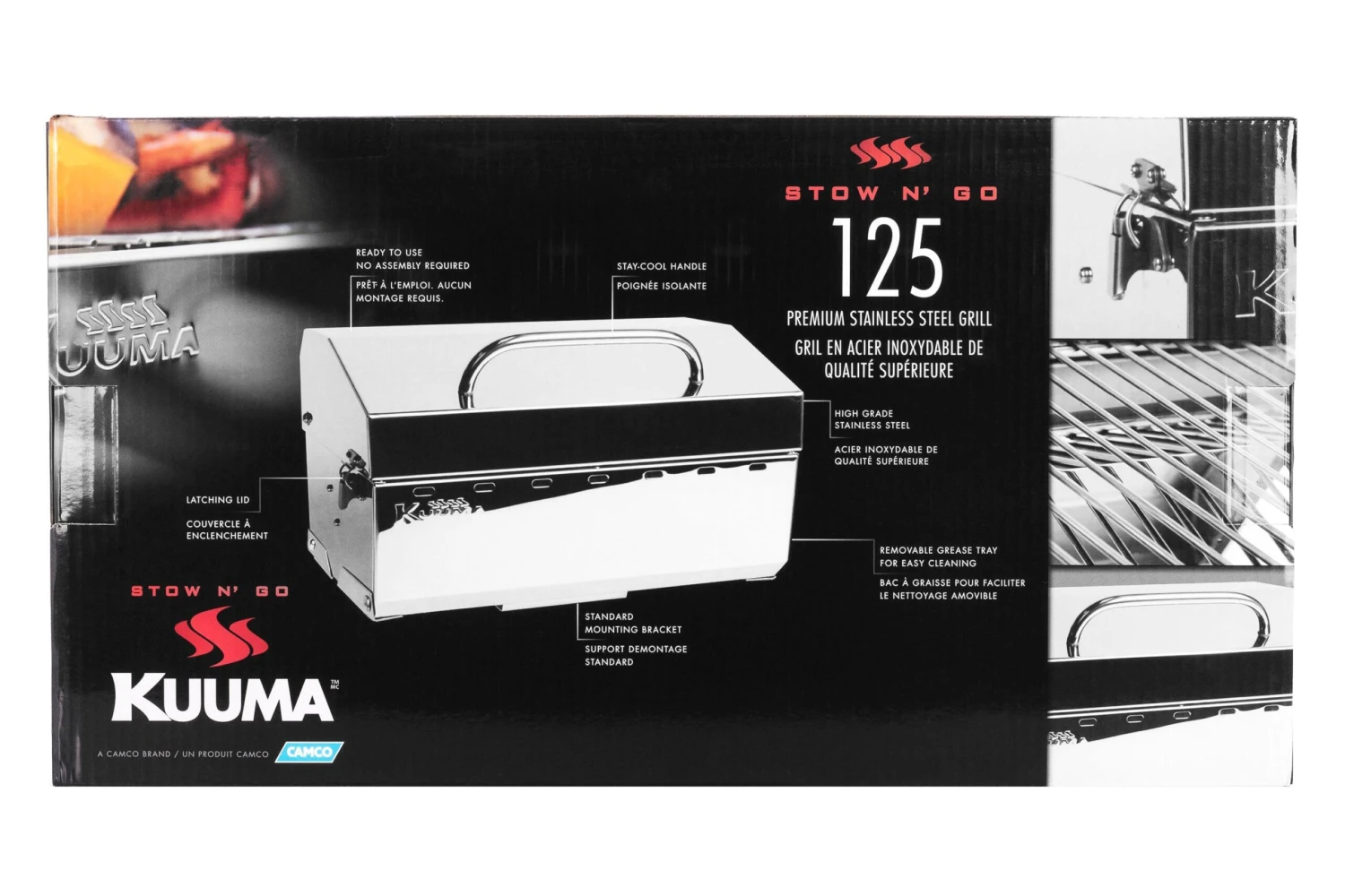 Stow N’ Go 125 Gas Grill by Kuuma®. The Kuuma Stow N’ Go 125 Grill is an outstanding grill that offers premium-quality construction and convenient portability. Its compact size is perfect for when space is at a premium. Stow N’ Go grills can be easily transported and can also be mounted to any Kuuma rail, rod or pedestal mount. Designed for high pressure, disposable 1 lb. propane canisters or larger refillable tanks with hose attachment. Canisters, tanks and hoses sold separately.