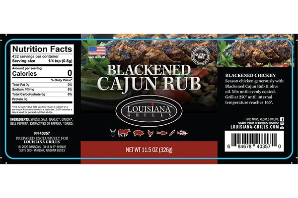 11.5 oz. 11.5 oz. Blackened Cajun Rub by Louisiana Grills®. Bring home the flavors of Louisiana with this Blackened Cajun Rub. This blend combines classic Cajun-style herbs and aromatic spices like garlic, onion, thyme, fennel and oregano. Sprinkle it on fish, seafood, chicken or pork for a deliciously savory crust with just the right amount of kick.