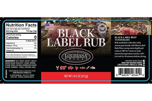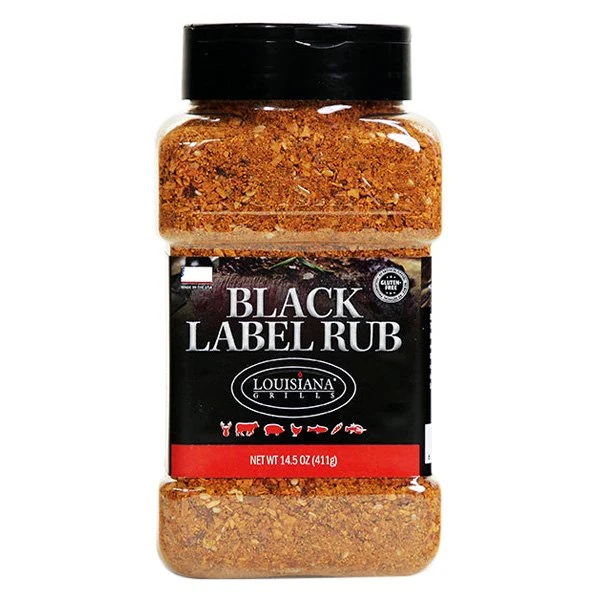 14.5 oz. 14.5 oz. Black Label Rub by Louisiana Grills®. A premium blend of rich shallots, brown sugar, caramelized onion and sesame seeds, the Louisiana Grills® Black Label Rub will transform the flavor of your favorite dishes. Specifically developed to complement a variety of proteins, this blend is delicious when paired with beef, poultry, fish, pork and vegetables.