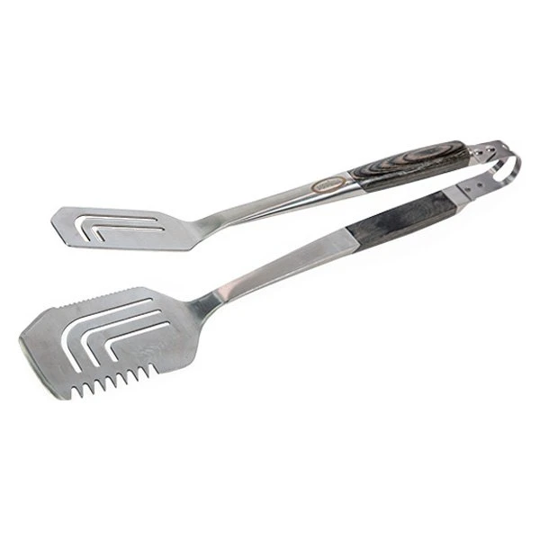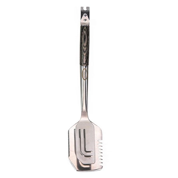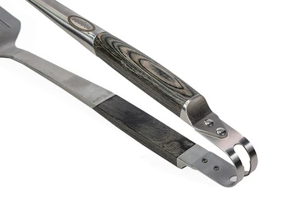 All-in-One Tool by Louisiana Grills®. Experience a tool that can do it all with the Louisiana Grills All-in-One Tool. Thanks to the double-spatula tong design, you can do everything that your spatula, tongs, meat clever and tenderizer can do – in one. Securely flip burgers and steaks or grab small foods like shrimp vegetables with ease. The dual-edge spatula head makes this tool an excellent choice to have nearby when preparing meats. Additional features include a premium wood-finished handle, dependable stainless-steel build, and quick access hanging loop.