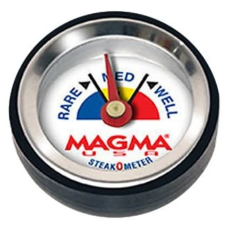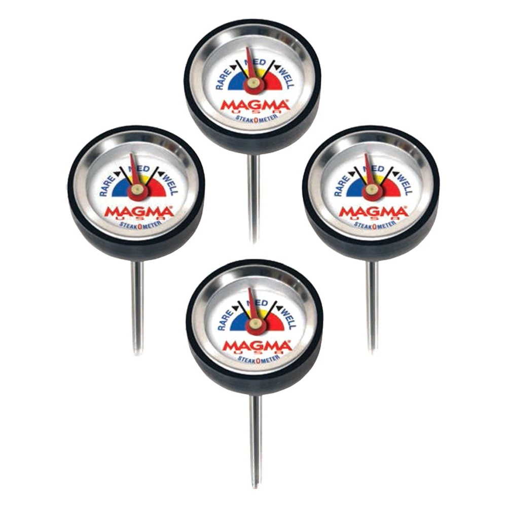 4 Pieces Gourmet Steak-O-Meters by Magma®. A cut above similar products, these 4 individual steak thermometers are constructed of 100% 304 marine grade stainless steel with an exterior silicone coating to keep them cooler to the touch. Each individual thermometer has an easy to read dial to indicate the exact level of doneness. No more guessing; rare, medium rare, medium, medium well, or well done.now you’ll always know with these Magma Steak-O-Meters.