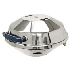 Marine Kettle™ Charcoal Grill with Hinged Lid (A10-104) by Magma®. Time tested original charcoal “Marine Kettle” grill now has a hinged lid. It is meticulously crafted of 100% 18-9 mirror polished stainless steel for maximum corrosion resistance. Rotating design allows you to determine which direction you would like the lid to open when grilling in windy conditions. You obtain perfect results through use of the adjustable height cooking grill and the variable temperature control draft door assembly. “Marine Kettle” design allows oven type baking to enhance the grill flavor while retaining the natural juices of the food. It will cook more food faster, on less grill area, than any other charcoal grill.