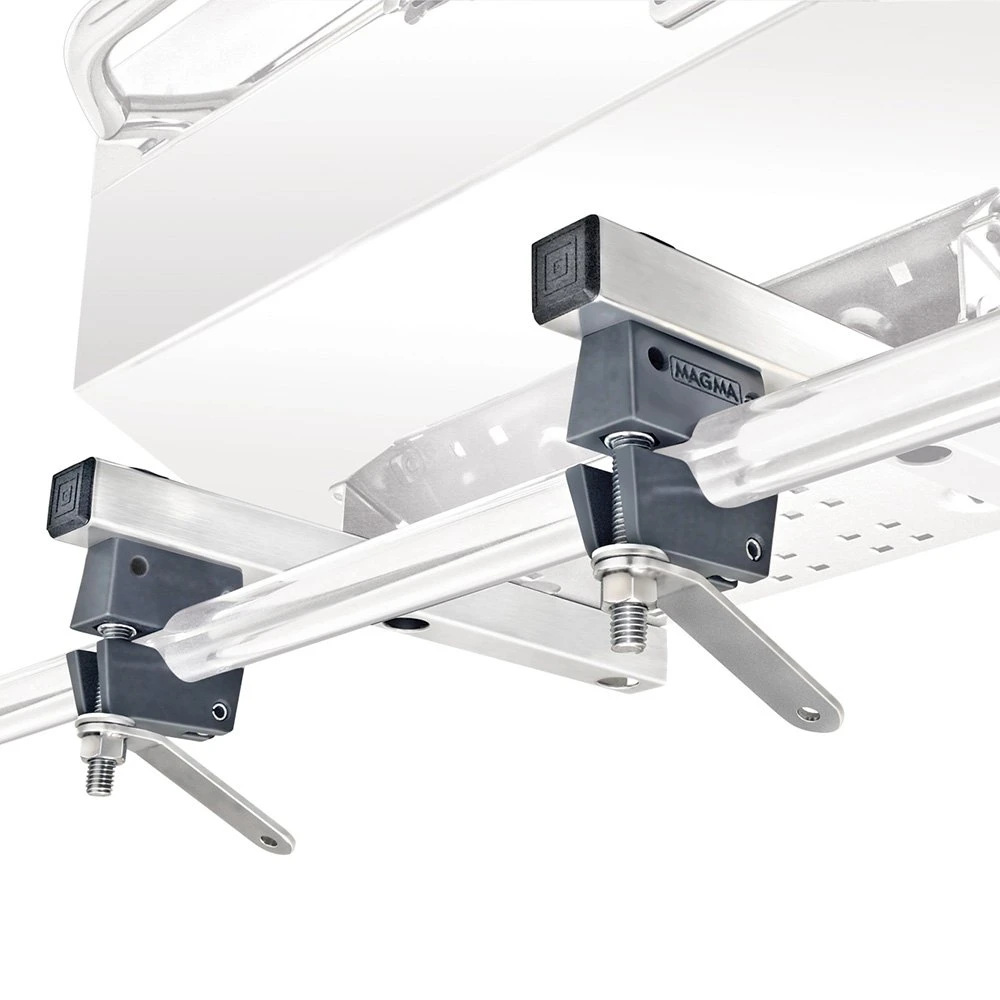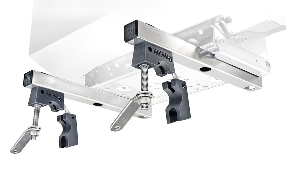 “Dual” Extended Horizontal Round Rail Mount by Magma®. This round rail mounting bracket is made entirely of 18-8 stainless steel and 356 hard anodized aluminum. The quick-disconnect system allows for quick disassembly leaving no hardware on the rail. Designed for mounting rectangular or dual-mounted filet tables out over the water.