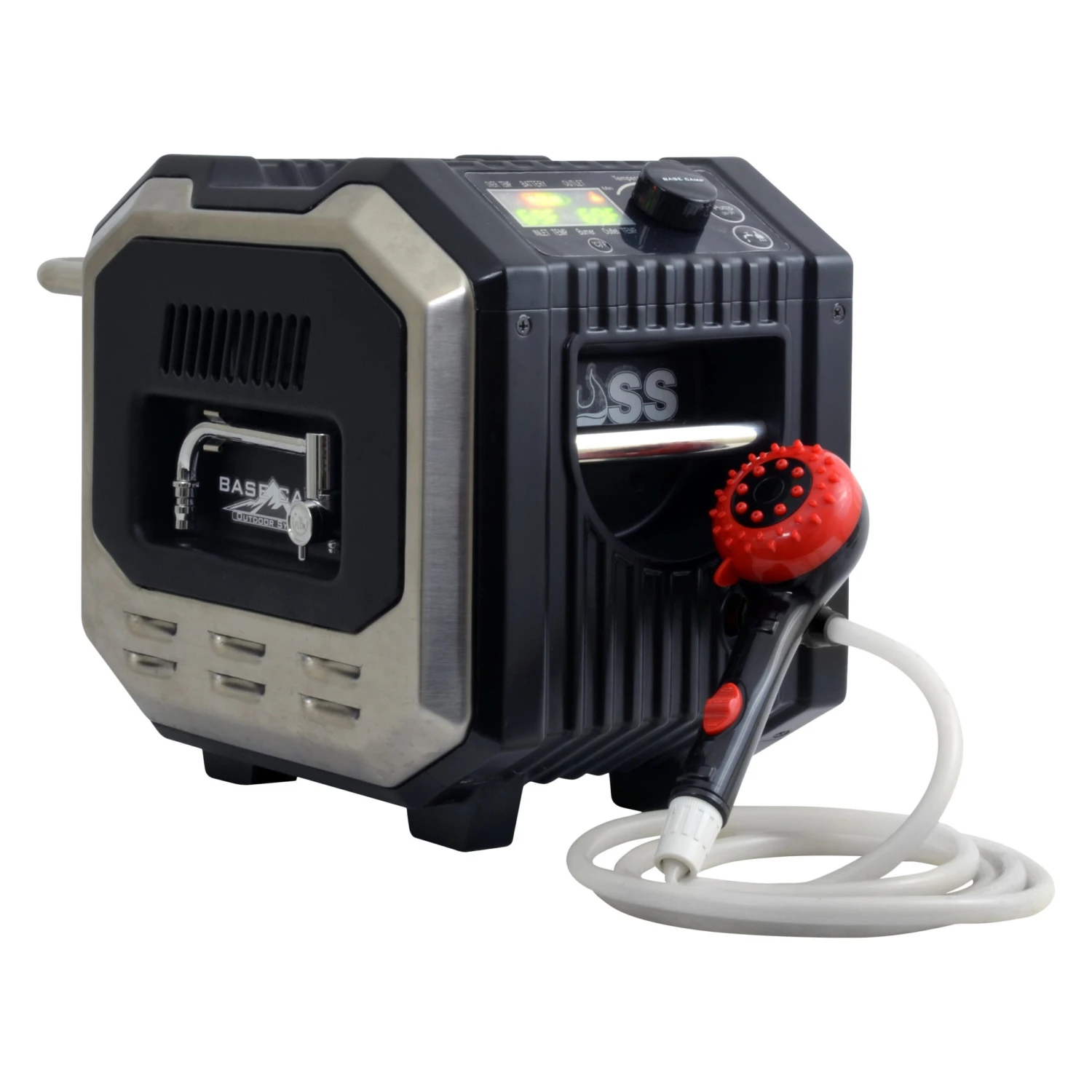 Base Camp™ BOSS Battery Operated Shower System by Mr. Heater®. The BaseCamp B.O.S.S XCW20 is the most advanced, portable hot water generator in the world. Simply charge the internal battery using the AC adapter or DC cigarette lighter, drop the pump in a bucket of water, press the ignition button, and dial in your temperature for a great shower anywhere. Or if you have dirty dishes simply select the faucet outlet and you can direct the water from the showerhead to the attached faucet for cleaning hands, dishes, and whatever else you get dirty while out in the field. With the B.O.S.S XCW20 all you need is a charged battery, water, and a 1lb. propane cylinder to have hot water at your fingertips in even the most remote places. DIGITAL. PORTABLE. CORDLESS. POWERFUL.