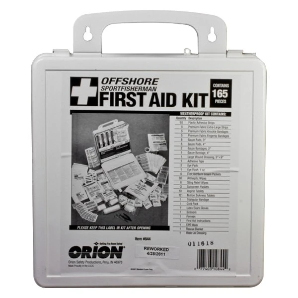 Offshore Sportfisher Marine First Aid Kit by Orion Signal Products®. Offshore sportfisher kit, 4 per case. Total protection for your family and guests basic first aid needs. This kit contains the necessities any offshore fisherman will need to prevent an early return to the dock. They have packed a full assortment of items in water resistant case that can be easily mounted to the bulkhead.