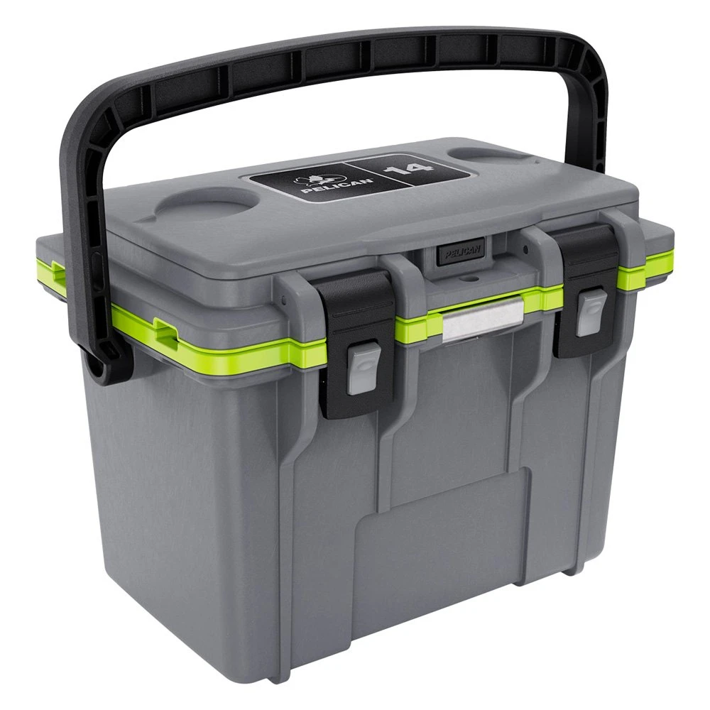 14 qt White/Gray Hard Cooler by Pelican®. Pelican® built the world’s most versatile personal cooler so you can pack everything you need into your weekend. Starting with commercial-grade, 1.5″ thick polyurethane walls and a freezer gasketed lid, all designed to hold on to the cold no matter how far you go.