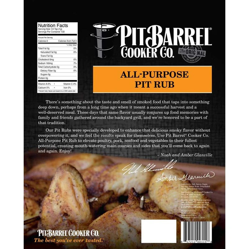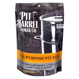 40.0 oz. 40 oz. All-Purpose Pit Rub by Pit Barrel Cooker®. All-Purpose seasoning blend is specially formulated for an outstanding balanced flavor that compliments the unique flavor from a Pit Barrel® cook. It’s great on beef, poultry, pork,seafood, or vegetables.