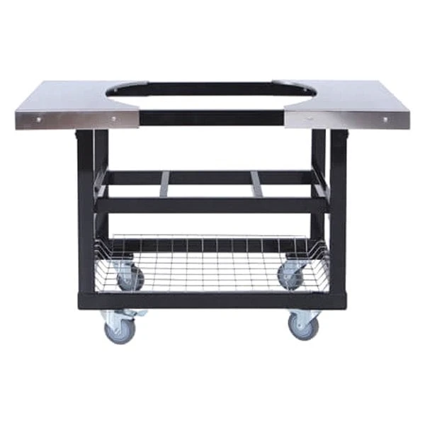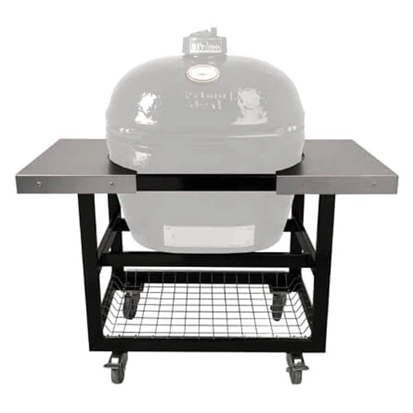 Cart with Basket and Stainless Steel Side Shelves (PG00320) by Primo Grills®. For Oval JR 200 Grill. The cart has two locking casters in the front to keep your grill in place while cooking. Primo sturdy metal Cart Base is intended for use with stainless steel and poly tops. It offers a lower basket and offers durability, protection and mobility.