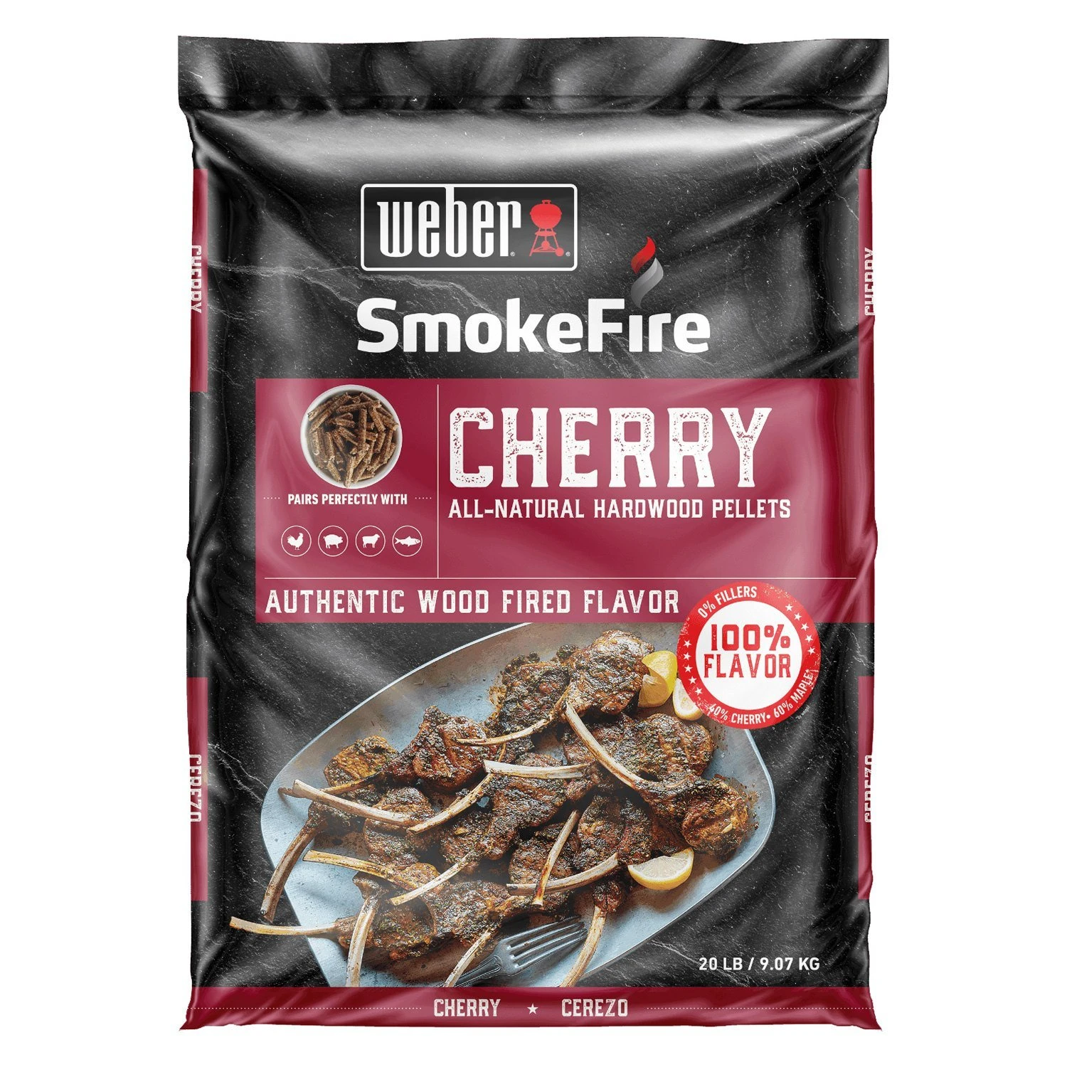 SmokeFire Cherry All-Natural Hardwood Pellets (190005) by Weber®. 20 lb bag of grill pellets. SmokeFire hardwood pellets were thoughtfully crafted for the best tasting BBQ. Designed to enhance the flavor of your food with no fillers, just authentic wood fired taste.