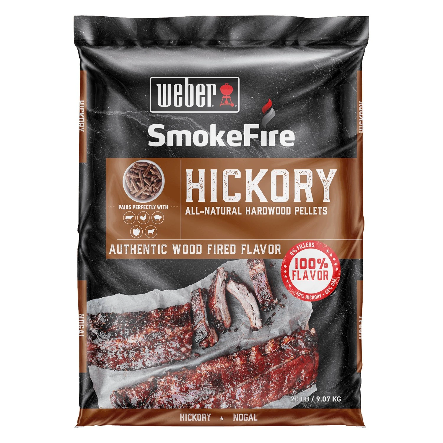 SmokeFire All-Natural Hardwood Pellets by Weber®. 20 lb bag of grill pellets. SmokeFire hardwood pellets were thoughtfully crafted for the best tasting BBQ. Designed to enhance the flavor of your food with no fillers, just authentic wood fired taste.